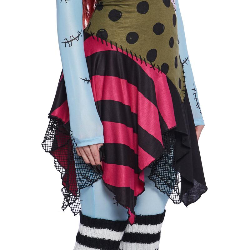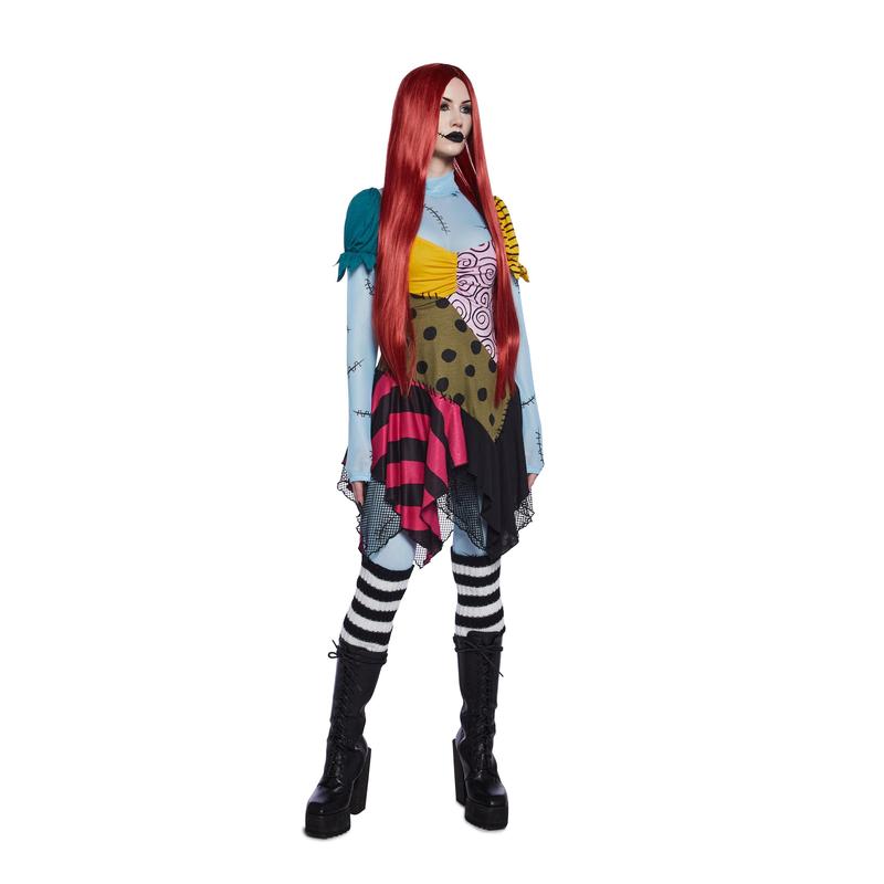 Stand by your Pumpkin King with this costume set that comes with a stretchy patchwork printed knit dress, short puff sleeves, a ruched bust, a fishnet mesh underskirt, and comes with a sheer blue mesh bodysuit with printed stitches all over and a back zipper closure. Includes a long red wig, and striped leg warmers.