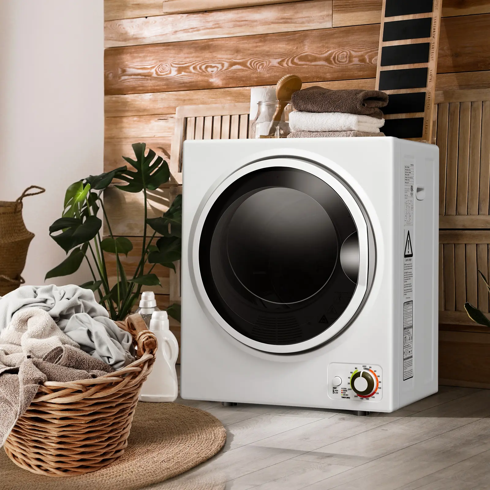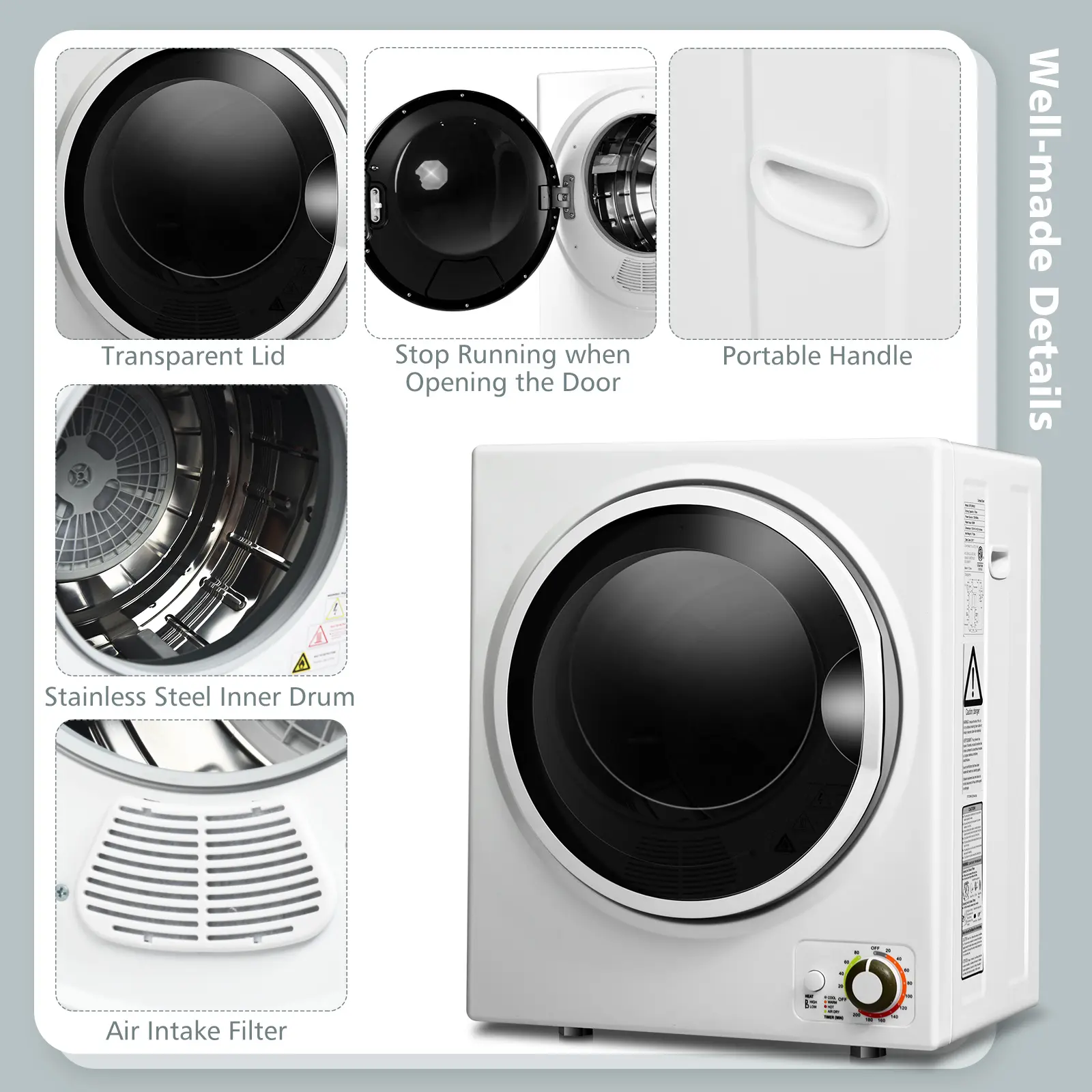 ● Multifunction: According to the material and weight of the cloth, you can set the time length or different mode for drying: Cool(0-20mins): cool down the temperature, Warm(30-120mins): dry and cool cloth, Anti-wrinkle, Hot (120-200min): for drying large quantities or bulky item, Air dry(0-80mins) run with cool air to freshening.
