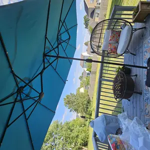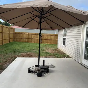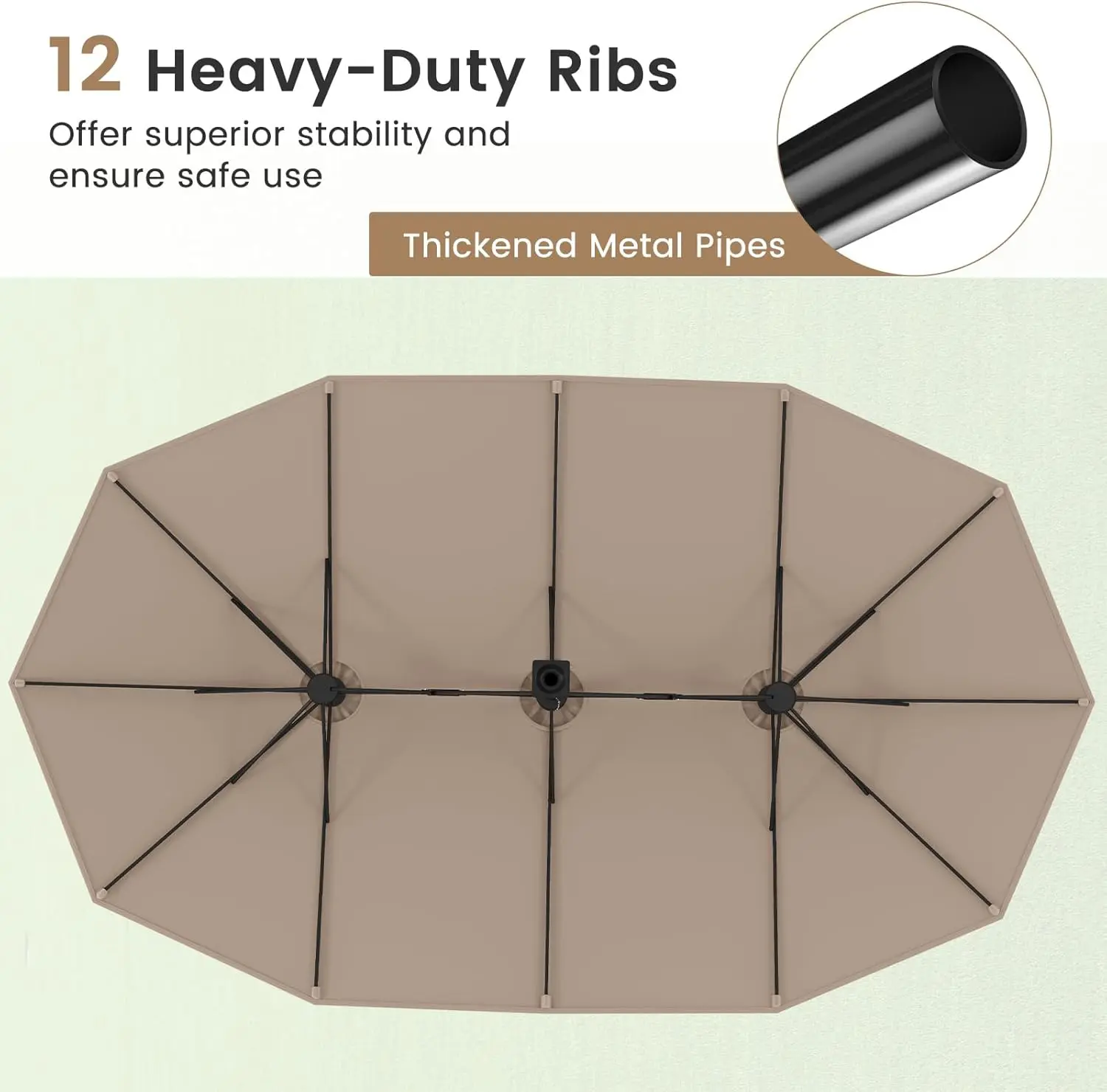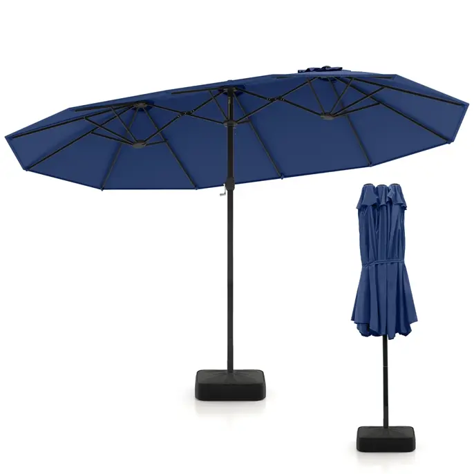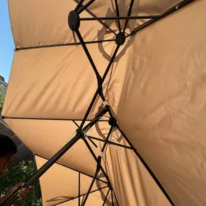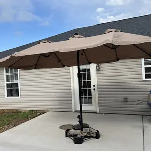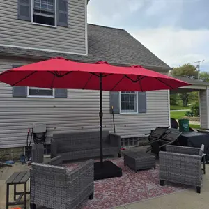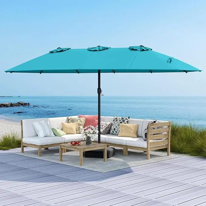 This patio umbrella features a 15ft double-sized canopy, perfect for families and friends. It offers a vast shaded area, ideal for relaxation or enjoying breezes. The canopy accommodates a furniture set comfortably, ensuring a premium shaded space. Enjoy the outdoors with this large umbrella in your garden, backyard, or pool area.