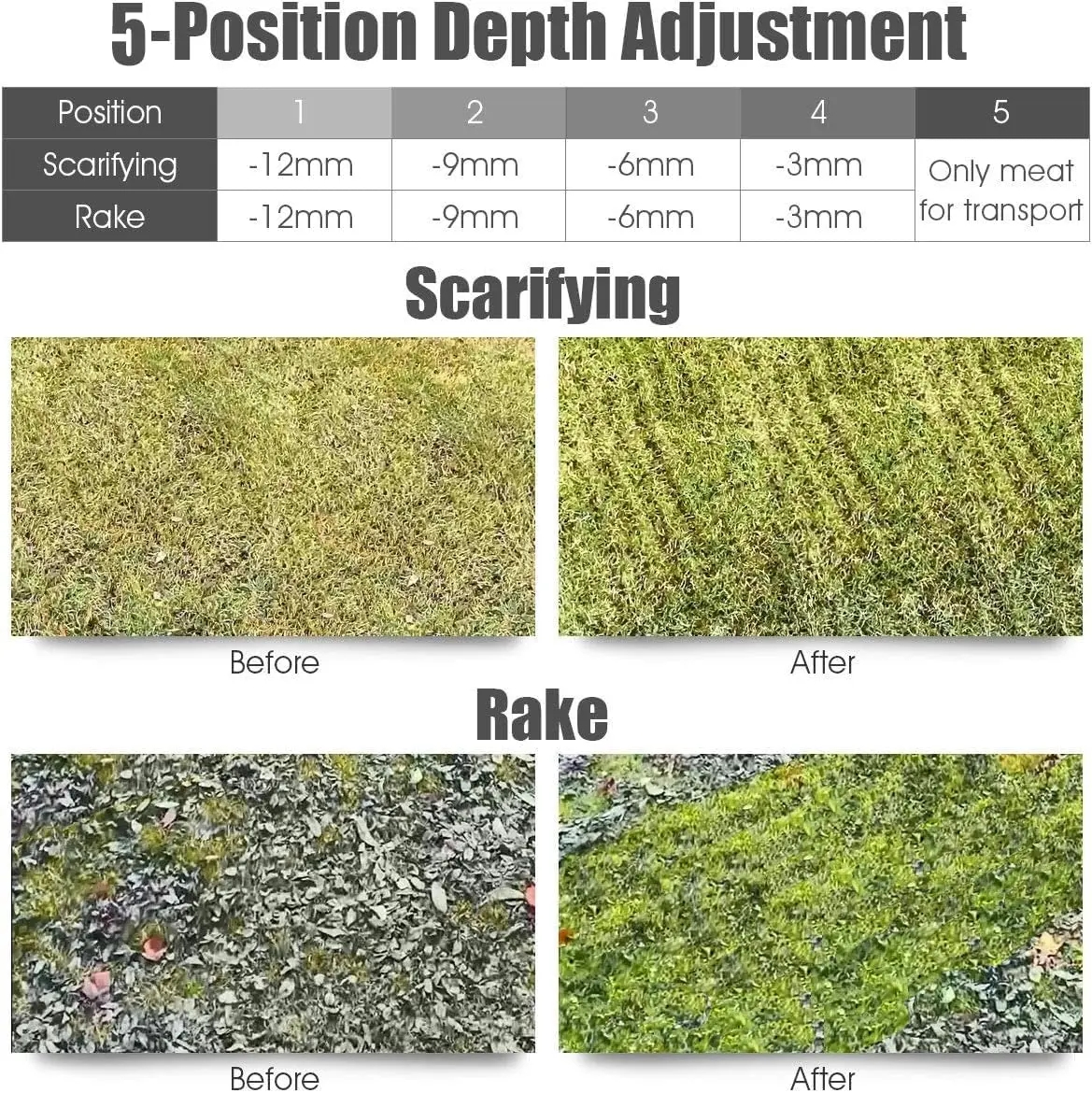 • 4 Cutting Heights: The lawn dethatcher has a 4-position height adjustment that is suitable for different grass types. In addition, you can easily select the necessary depth to scarify your lawn and perforate the soil to promote healthy grass growth.
