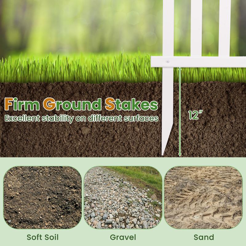 ● Versatile Configuration: Tailor your boundary as per your landscape's needs with the flexible joint design that allows for both horizontal and vertical connections. These adaptable fence panels enable you to easily follow the contours of different places. ● Premium Vinyl Material: Each 80"L x 51"H fence panel is made of premium PVC that promises exceptional weather resistance, sun protection, and simple maintenance. They will stay sturdy and enduring during the long-term outdoor use. ● Dig-Free Installation: Discover the joy of easy, no-dig setup with the garden fencing. Simply position and insert the sturdy ground stakes for securing. The picket fence is suitable for soft ground and the recommended depth for inserting the stakes is 12". ● More Classic Charm: Thanks to the beautifully slatted surface and delicate caps, the patio fencing panels elevate your outdoor aesthetics. This thoughtful combination ensures your property stands out with style and sophistication. ● Safe Choice for Wide Use: Ideally designed to offer not just beauty but functionality, the picket fence blends well into gardens, poolside areas, porches, etc. At the same, it also creates a secure play space for your children and pets.