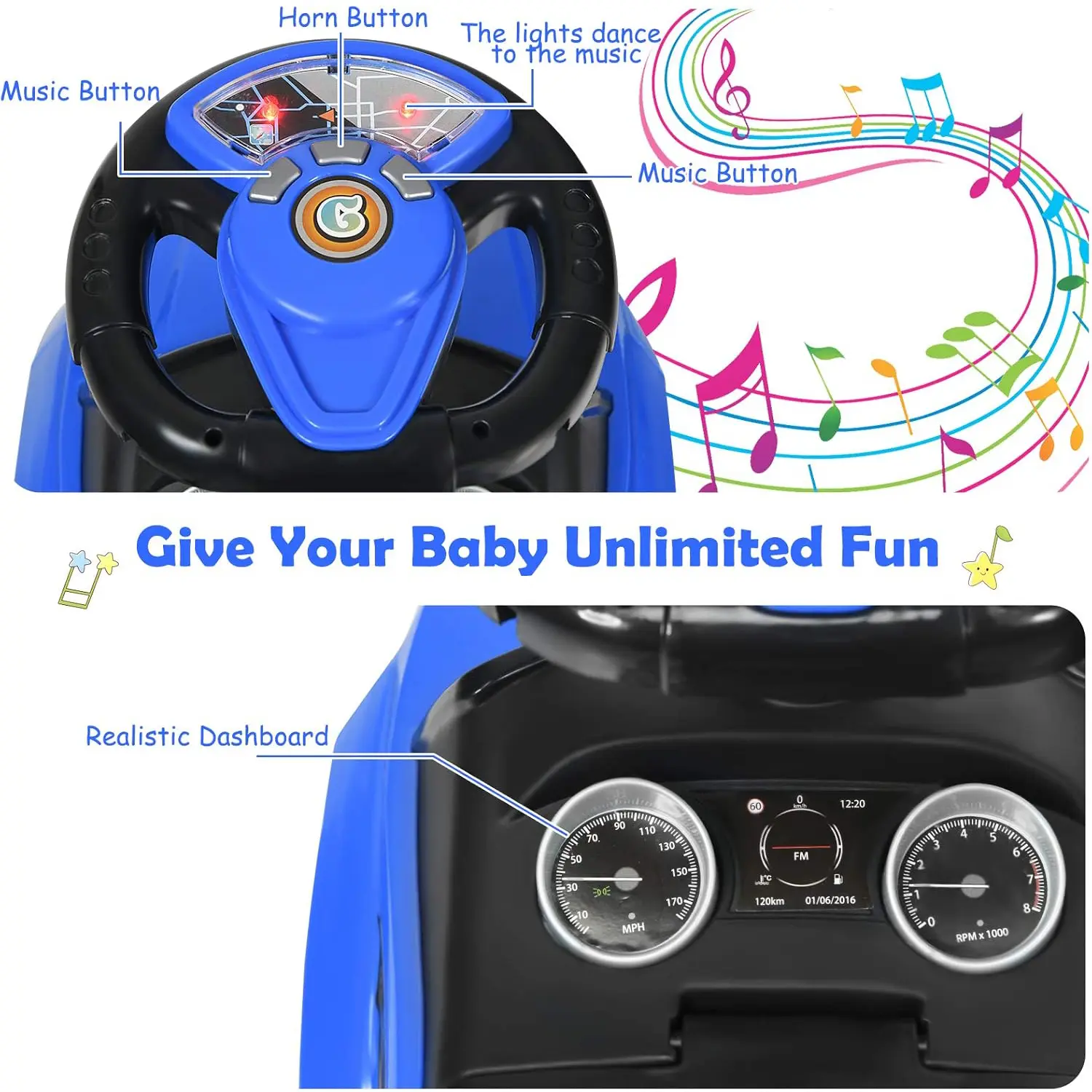 ·【Music Functions for Joyful Driving】Designed with a rotatable steering wheel with a music button, a horn button, and your lovely child can press the button and the effect of the light will dance to the music, adding more fun to their riding. The wide seat and soft backrest adopt ergonomic design to provide toddlers with a comfortable sitting feeling.