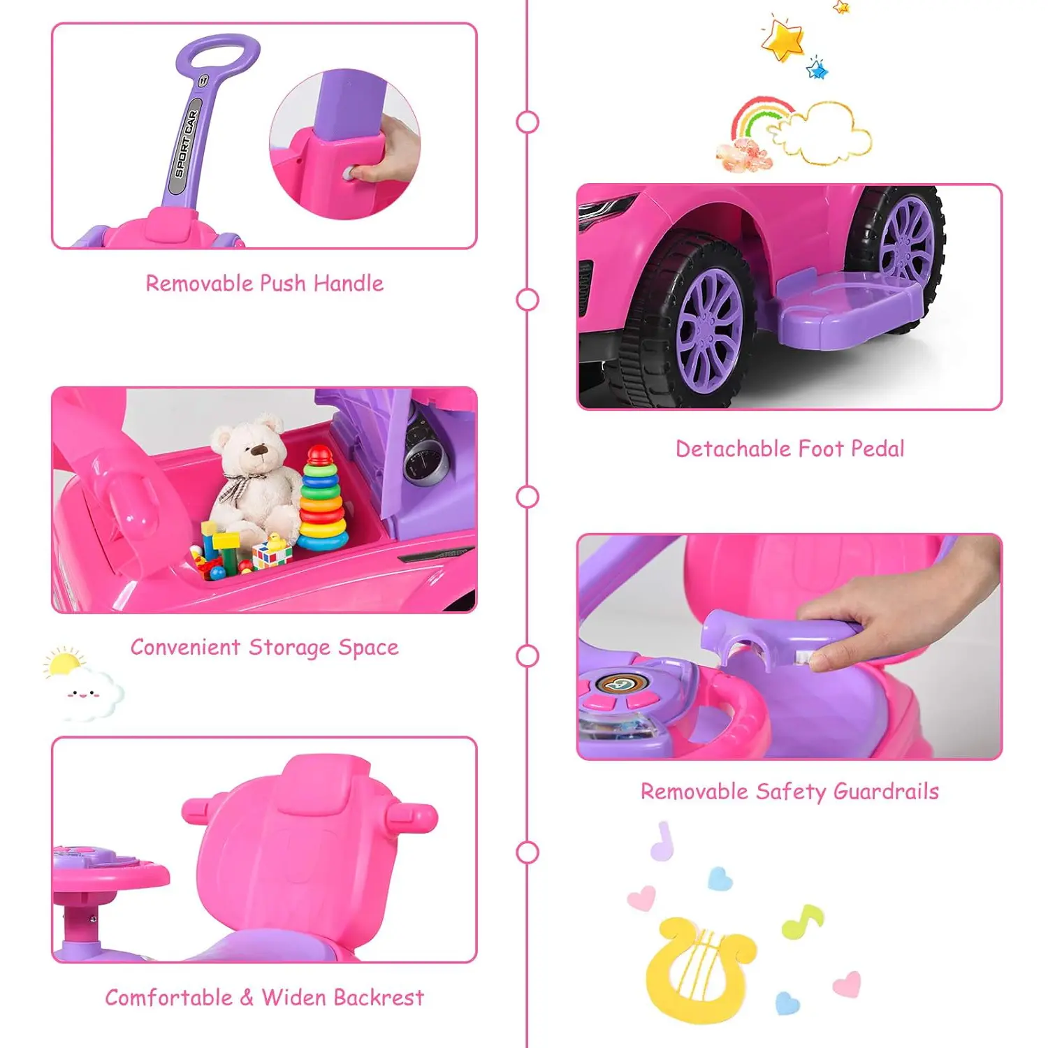·【Control Handle & Built-in Storage Space】Equipped with a removable handle, parents can use this toddler push car to push or pull, and turn left or right. The handle grip is widened, making you pull and push more comfortably. Moreover, there is a hidden storage space under the seat for children to store toys, snacks, story books, and other small items while going out.