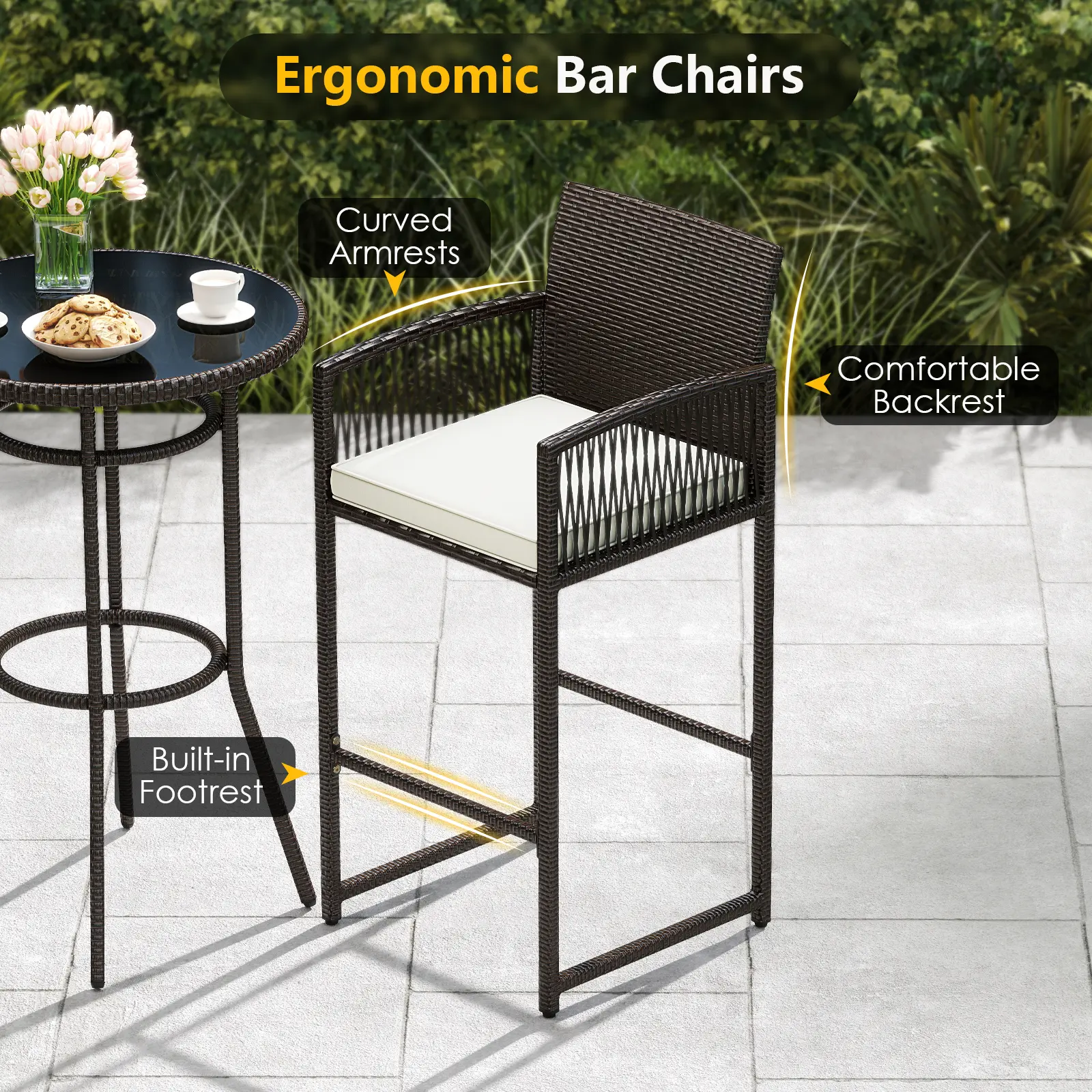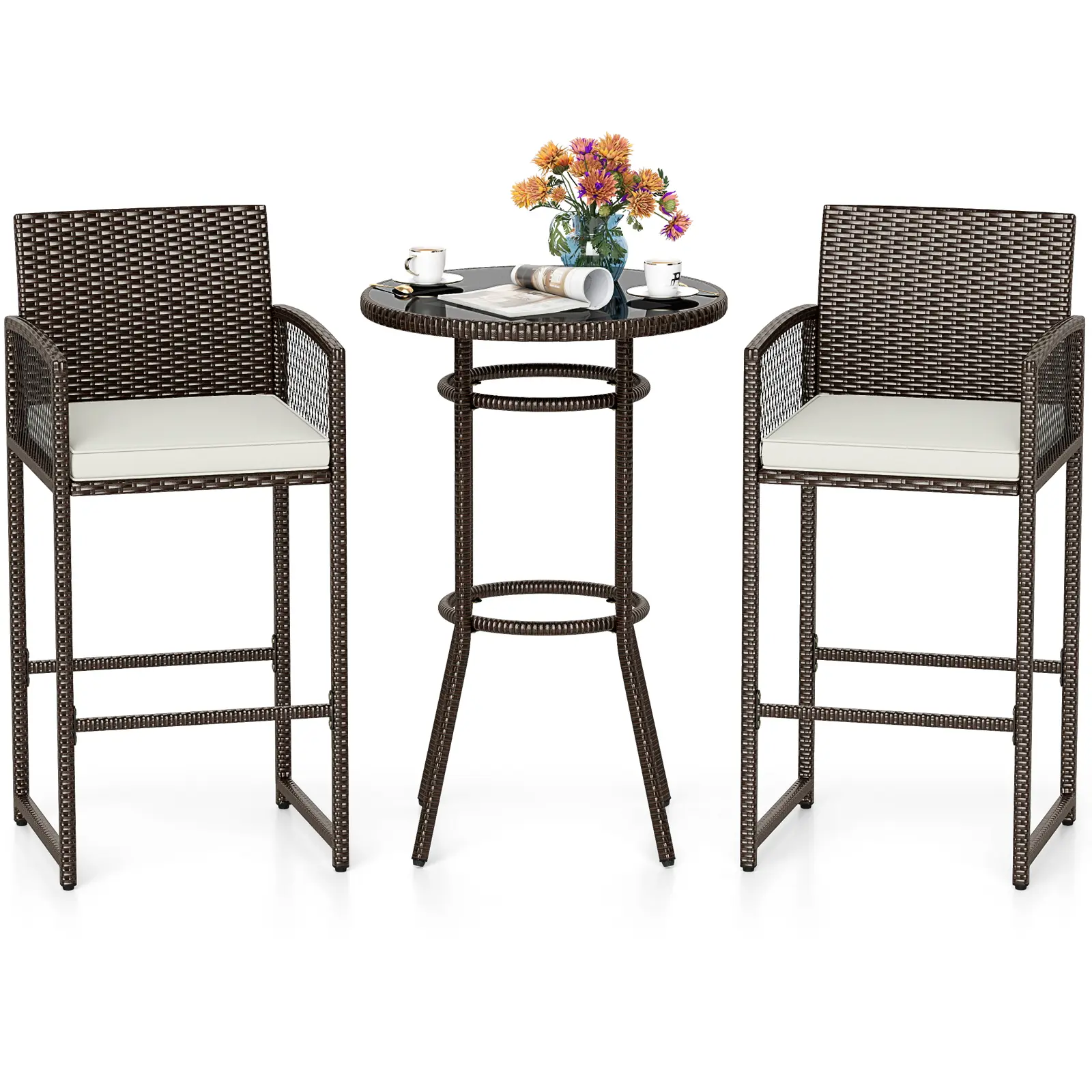 COSTWAY - 3 Piece Patio Bar Set Outdoor Wicker Bar Height Round Table and Armchairs-White