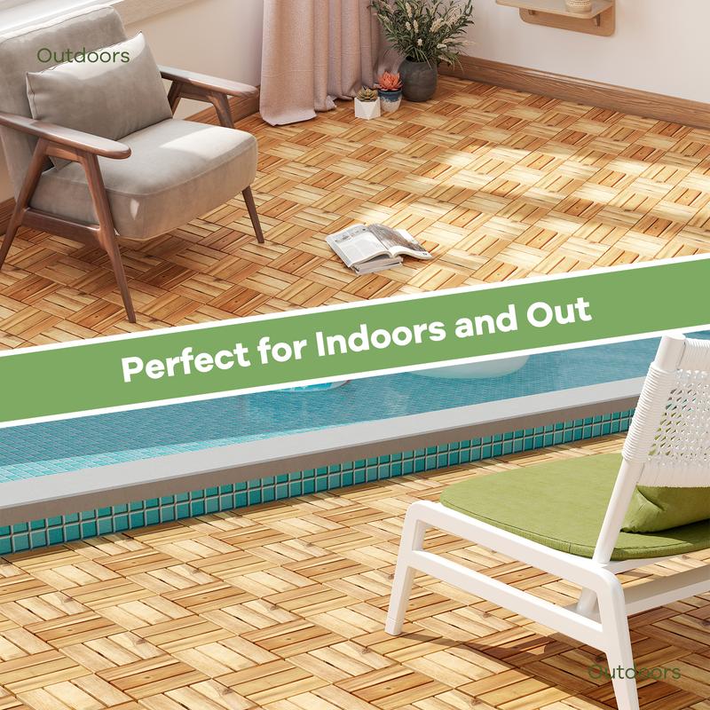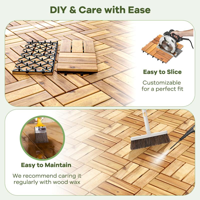 ● Quality Acacia Wood Material: Crafted with high-quality acacia wood material, the interlocking patio deck tiles are enduring, not easy to crack, and not easy to deform. The wooden tiles can also bring natural texture and charm to any space with exquisite wood grains. ● Handy Inter-Lock Mechanism: Say goodbye to complicated installation with a convenient inter-lock mechanism. The long screws and elastic joints enable you to easily snap the deck tiles together without tools, providing larger coverage. The 30 pcs deck tiles can cover an area of 29 Sq.ft. ● Convenient & Quick Drainage: Each patio deck tile is equipped with spaced slats for great ventilation and quick drainage. Moreover, the elevated design of the PP base also ensures better drainage to prevent water logging. ● Versatile & Practical Design: The acacia wood flooring tiles are suitable for various indoor and outdoor places, such as dining rooms, poolsides, gardens, patios, porches, and more. The anti-slip and splinter-free surface make them safe to use. ● Simple to Cut and Maintain: You can cut each tile with a saw to customize its shape and size to fit any area. The patio floor tiles can be easily wiped clean with a soft cloth. It is recommend to polish oil to all the surface periodically. Note: Please avoid direct exposure to sunlight to extend its service life.