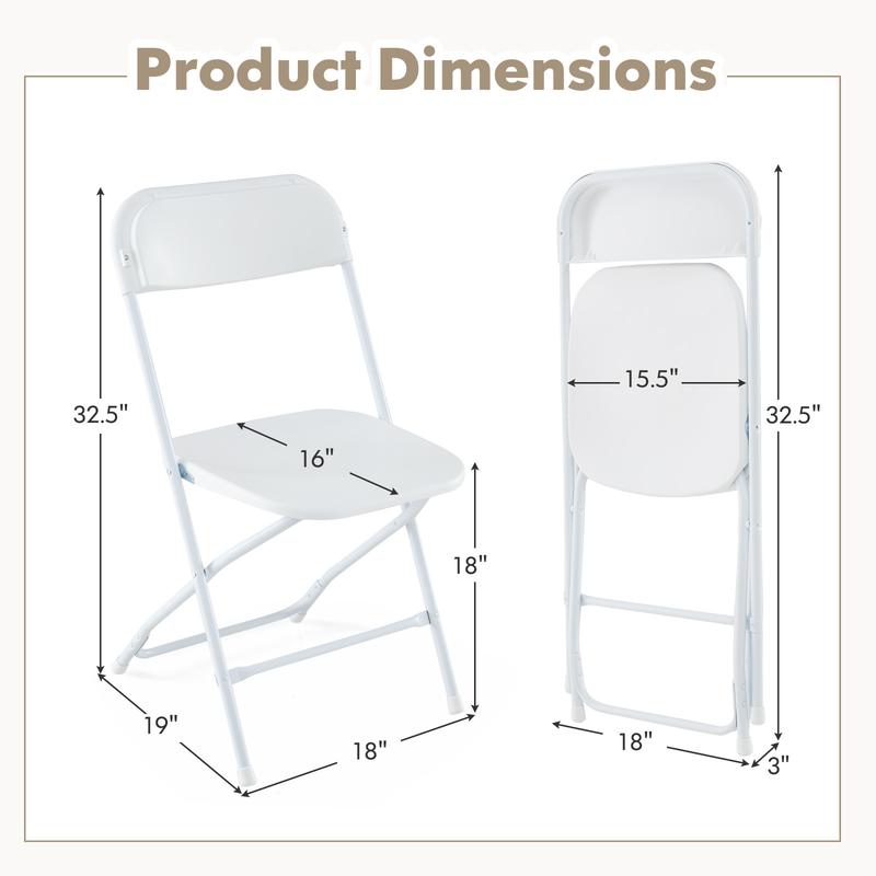 ● Perfect Seating Choice: With appealing white look and portable design, these folding chairs will be a versatile option for various occasions, such as home, office, weddings, and parties. ● Heavy-Duty Metal Frame: These chairs boast a robust metal frame which is anti-deformation and super solid, ensuring that each chair can load up to 770 lbs. Moreover, the X-shaped structure and non-slip footpads add higher stability. ● Premium PP Seat and Back: The seat and back of chairs are made of high-quality PP, which is waterproof, sunproof and anti-fading. As a result, these chairs can withstand long-time outdoor use and is quite simple to maintain. ● Convenient Folding Chairs: Easily foldable for compact storage and transport, these chairs are perfect for saving space at home or when on the move, making setup and teardown effortless. ● No Assembly Need: Ready to use right out of the box, these folding chairs save time and hassle, allowing you to quickly prepare for any gathering or event without the need for tools or assembly.