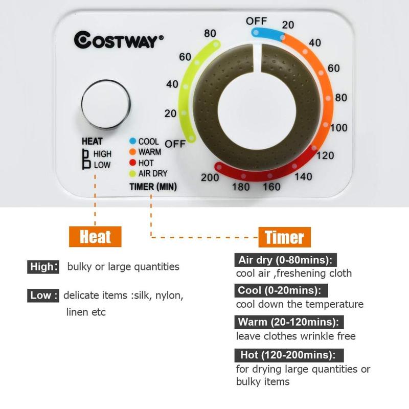 ·Multi-functional Drying ModesChoose the perfect setting based on your fabric: Cool (0-20 mins) for cooling, Warm (30-120 mins) for drying and cooling, Hot (120-200 mins) for bulky items, and Air Dry (0-80 mins) for freshening with cool air.