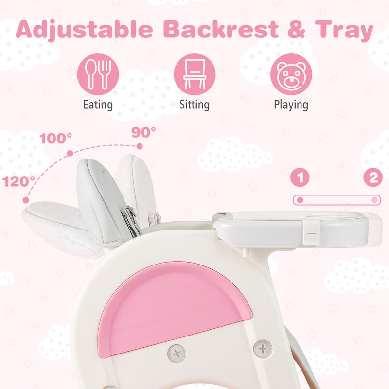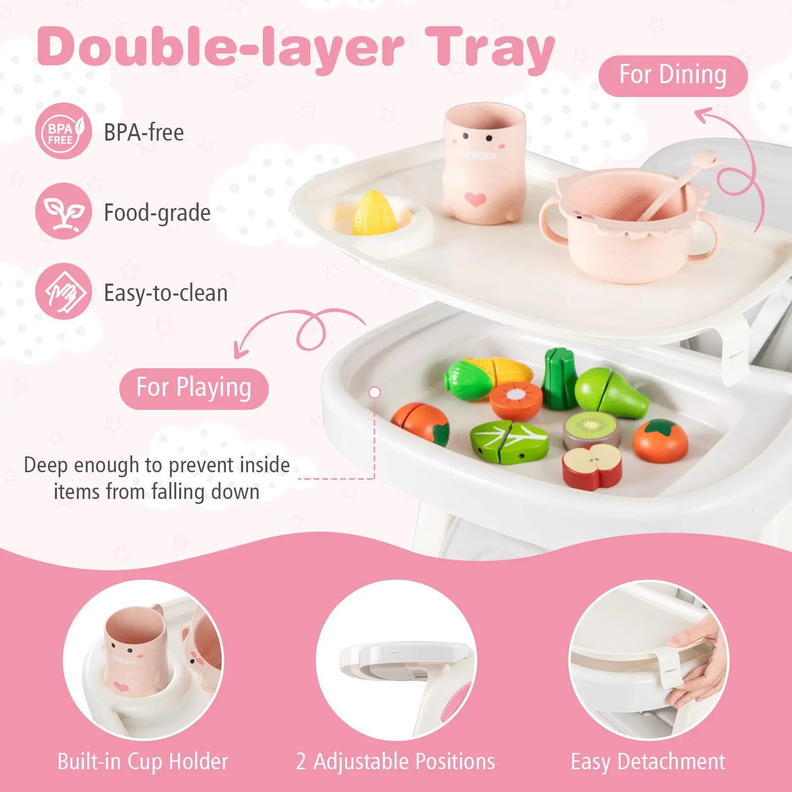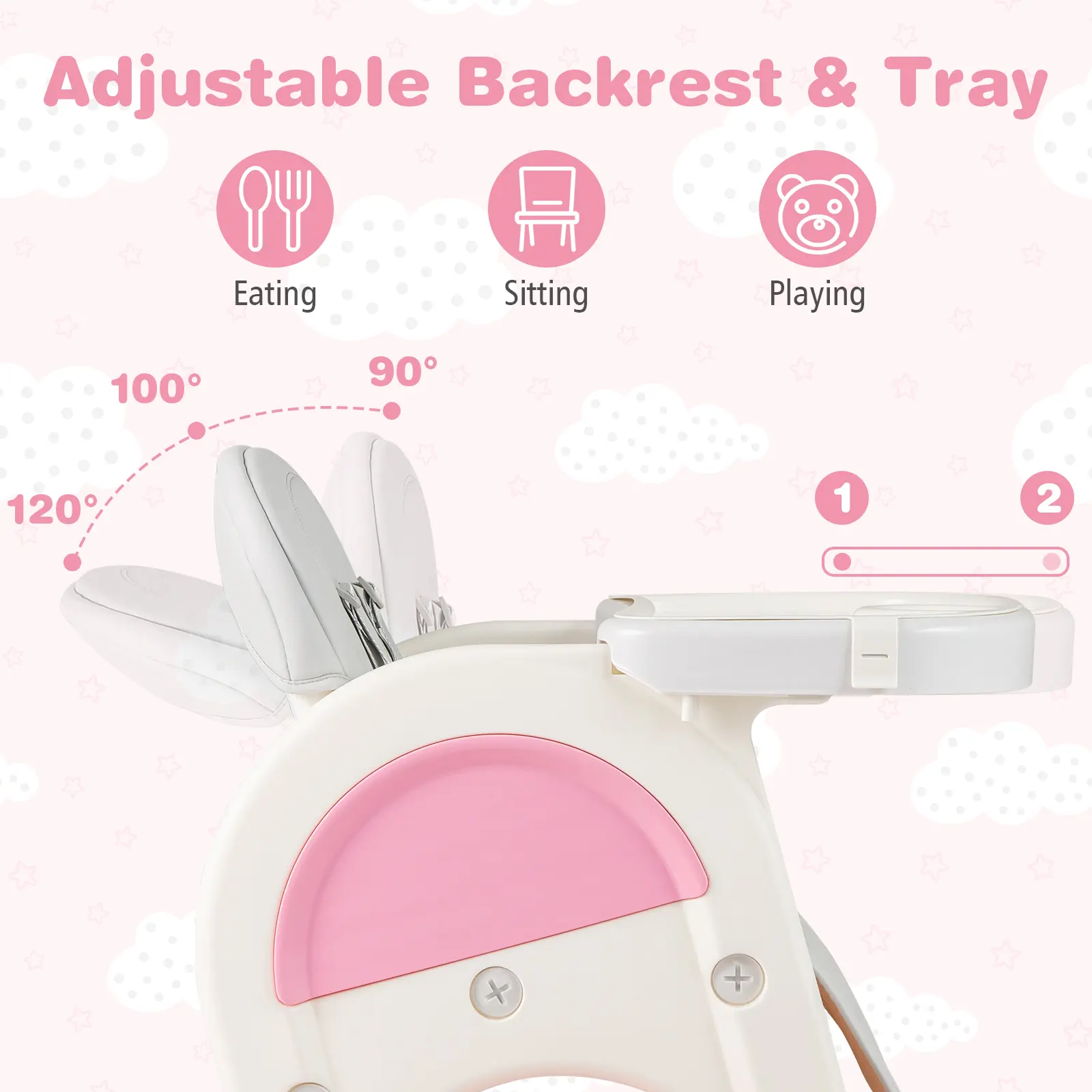 The 3-level adjustable backrest and 2-level adjustable tray ensure ergonomic comfort and enough activity space. The double-sided tray can be removed when not in use.