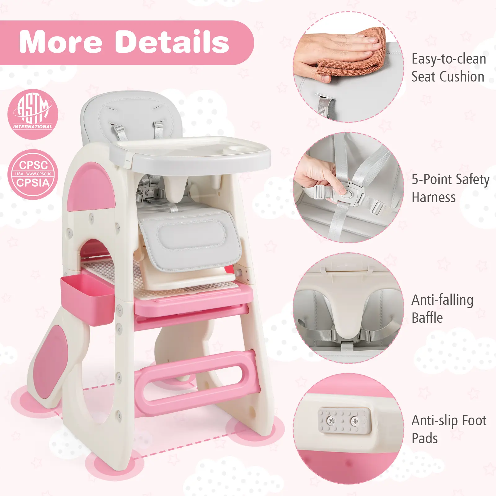 The 5-point safety harness secures your baby in the seat, while the anti-falling baffle brings more safety protection. It is also ASTM/ CPSIA compliant, ensuring high security and reliability. The pyramid structure and anti-slip foot pads keep the high chair steady and sturdy.