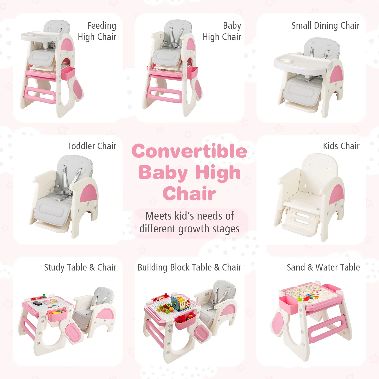 The feeding high chair can be easily converted into a small dining chair, toddler chair, kids chair, sand & water table, study table and chair set, or building block table and chair set. Various modes allow your little one to eat, sit, play, read, or study.