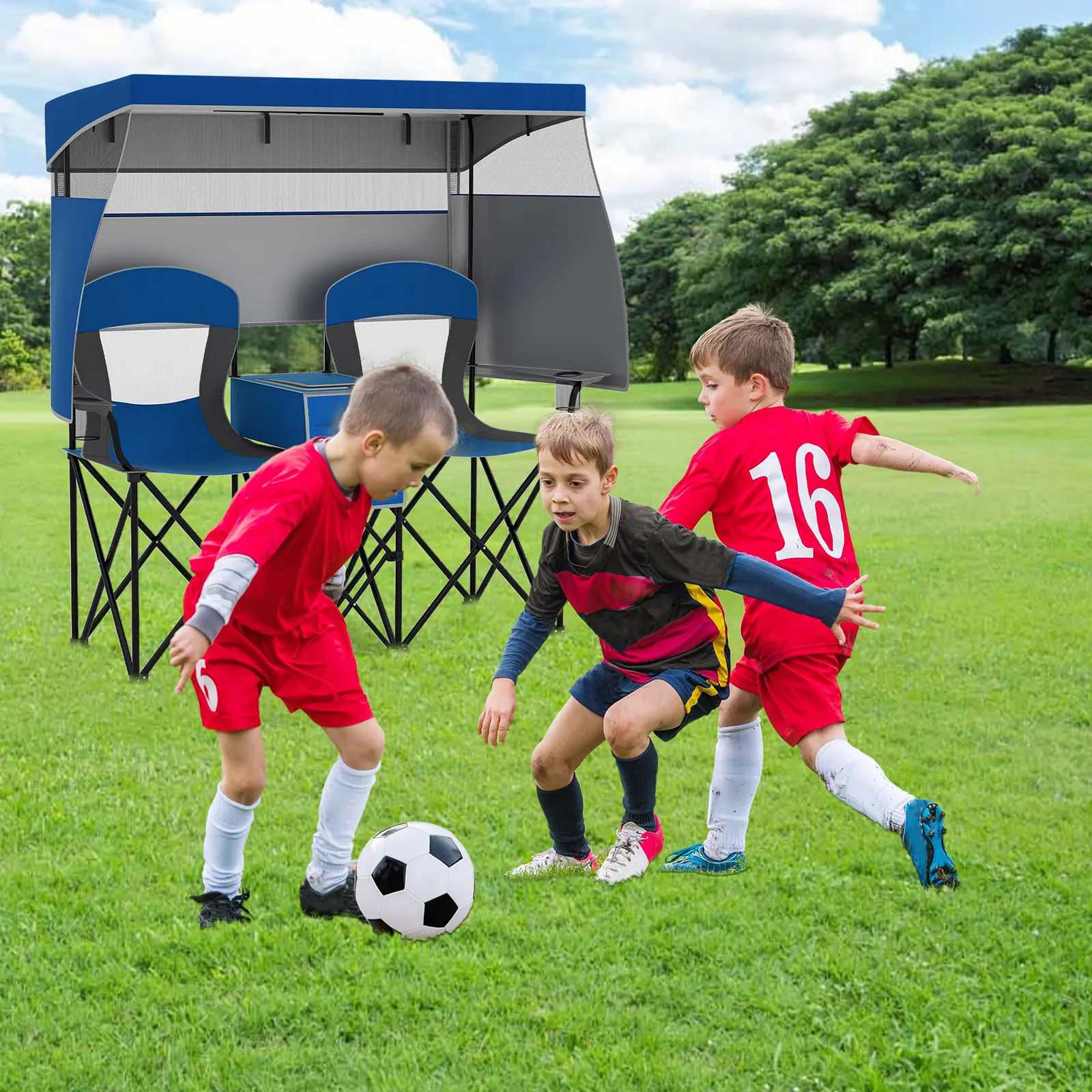 ● Versatile Storage Options: Stay organized with a large cooler bag between the 2 seats, perfect for keeping beverages cold. Additionally, this chair includes a front storage bag, 2 cup holders, and 2 phone holders, ensuring you have everything you need within reach for a relaxing day out.