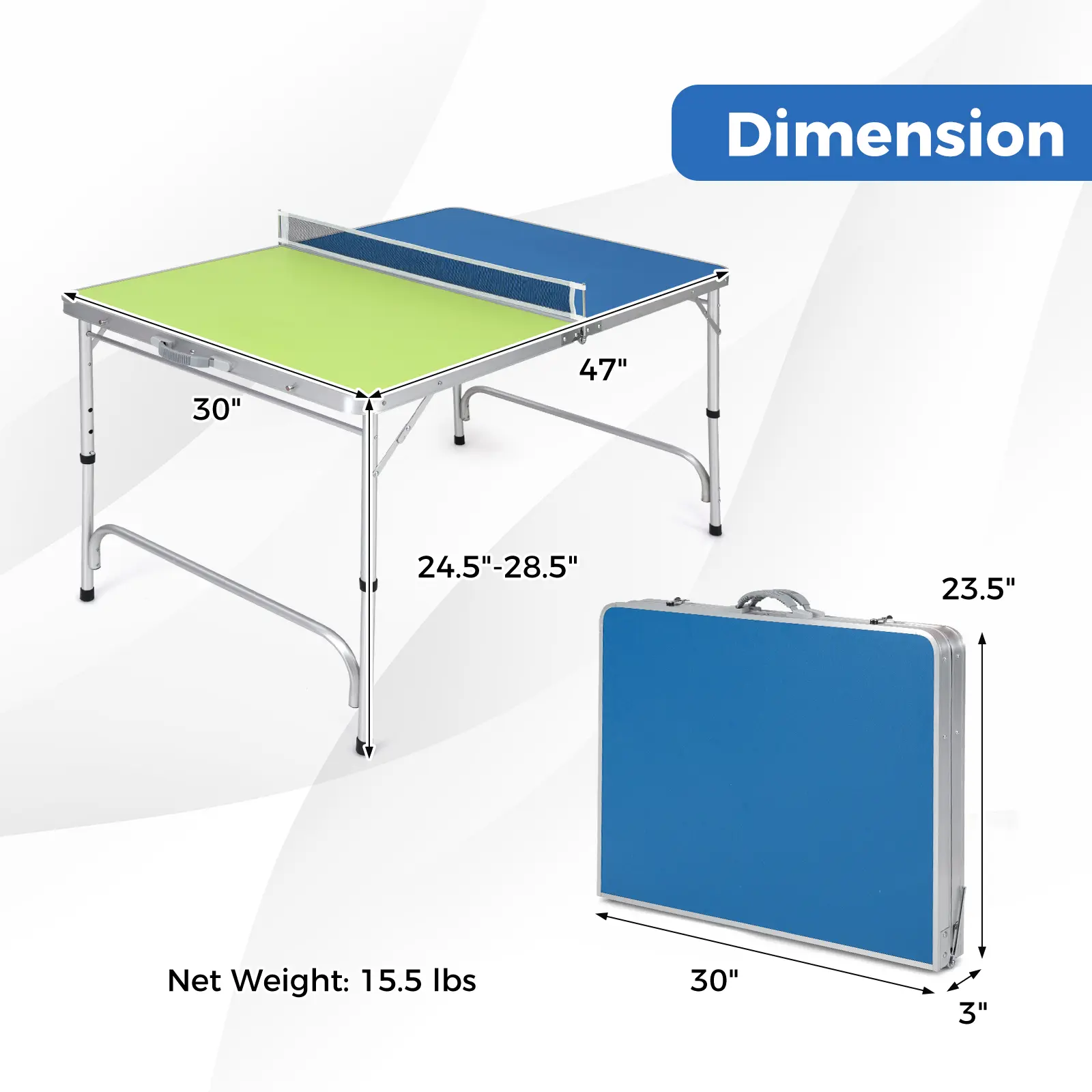 ● Portable Mini-Size Ping Pong Table: With a foldable design, this ping pong table can fold flat for space-saving storage when not in use, or for use on the go, making it ideal for small apartments, dorms, and more. Table dimension: 47" x 30" x 24.5-28.5"/120 cm x 76 cm x 62-72 cm (L x W x H). ● 3-Level Adjustable Height: Whether accommodating the varying needs of children or adults, the adjustable feature ensures comfortable gameplay for all players. More, no tools required for height adjustments. Tabletop height: 24.5"/62 cm, 26.5"/67 cm, 28.5"/72 cm. ● High-Quality Construction: Built with a sturdy aluminum frame, this table tennis table is designed to withstand both indoor and outdoor play. The reinforced leg locks and anti-slip, anti-scratch foot pads ensure stability and longevity. ● All-in-One Game Set: This table tennis game table comes equipped with everything needed to start the game right out of the box. This complete game set includes 1 net, 2 paddles, and 2 balls. ● Applicable to Various Scenarios: Whether it's at home, school, the office, or outdoor gatherings, this ping-pong table is the perfect choice to easily adapt to different environments and crowds, providing an excellent entertainment experience for friendly matches.