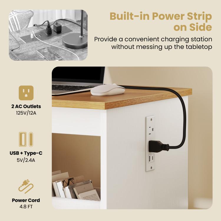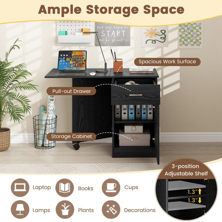 COSTWAY Folding Computer Desk with Storage Drawer & Cabinet, Compact Home Office Desk with Adjustable Shelf, Sewing Machine Table with Charging Station and Lockable Casters, Space-Saving Foldable Side Table for Bedroom, Office, Study, Black/White