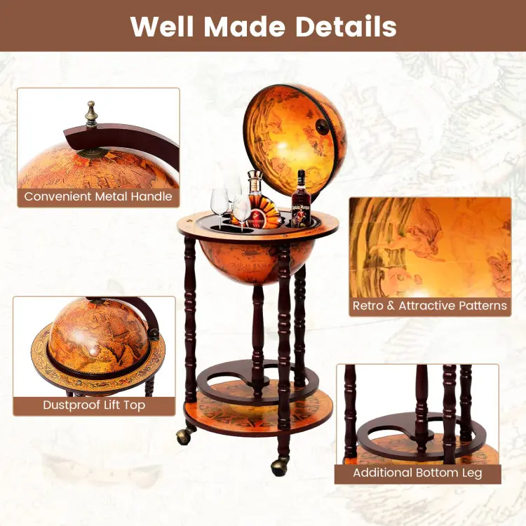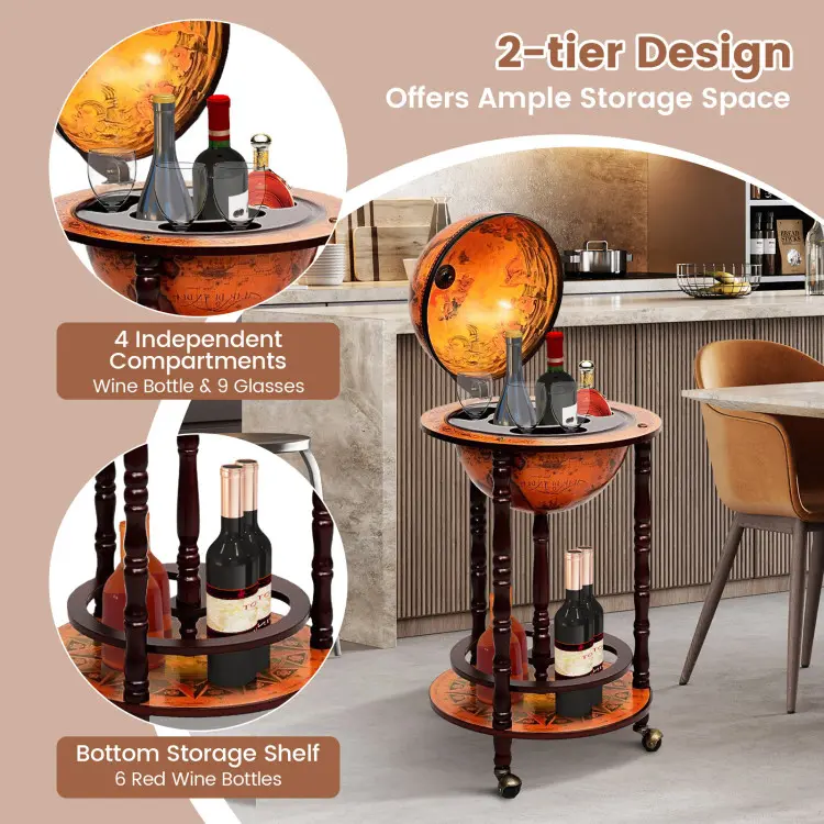 5. Giantex Globe Bar, Wine Bar Stand Italian Wooden Globe Wine Cart Liquor Bottle Shelf, 16th Century Retro Wine Cupboard with Wheels for Dining Room Living Room, Retro Brown