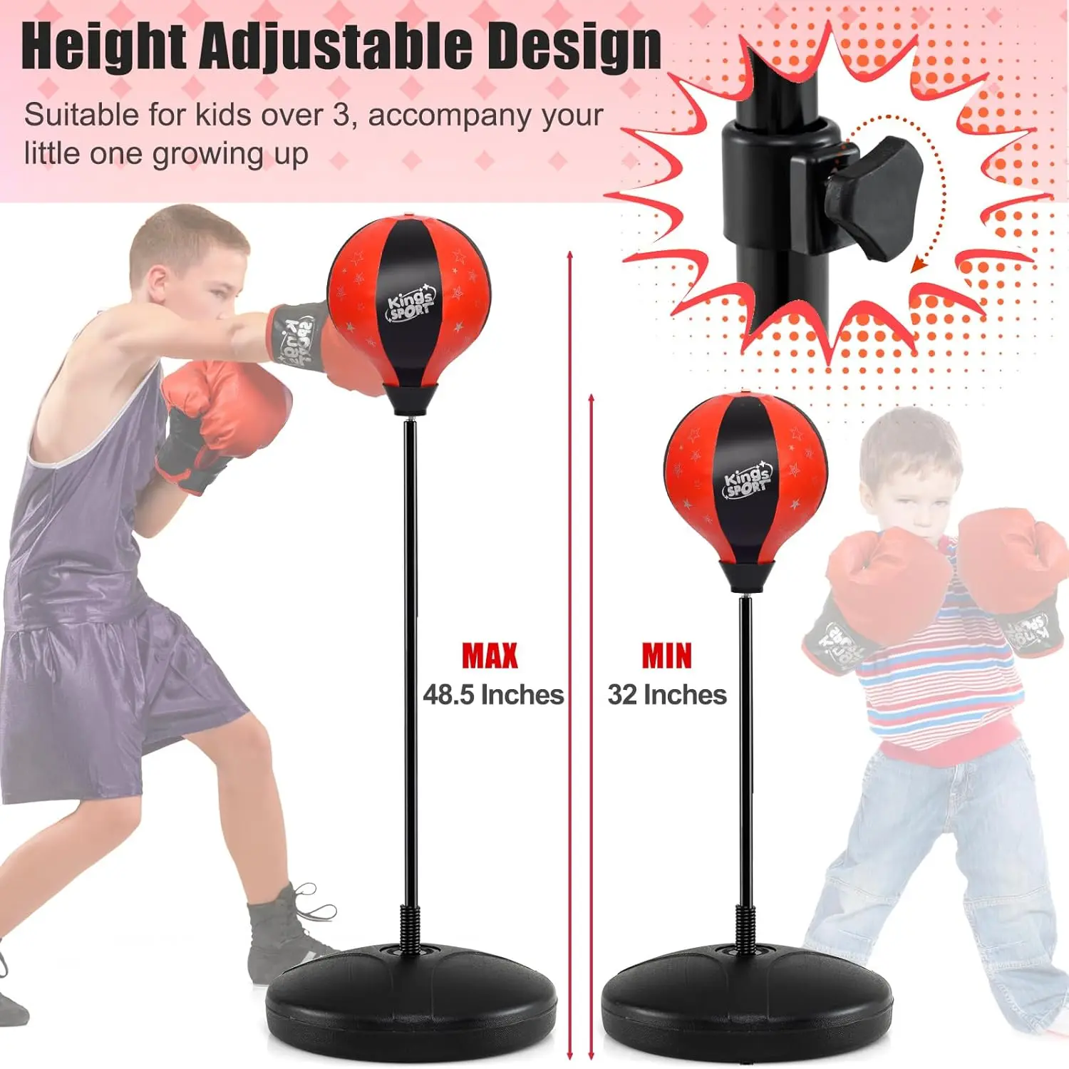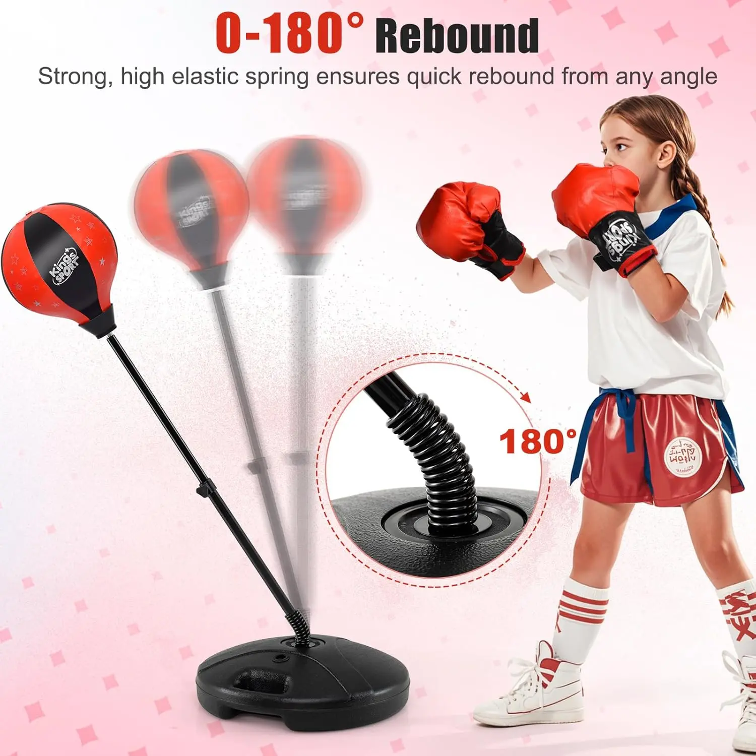 ·Developing Kid’s Boxing Skills : Standing punching bag can improve kids’ hand-eye coordination ability as well as enhance their physical strength and establish confidence. Besides, it is a perfect enlightenment tool to teach kids how to boxing.
