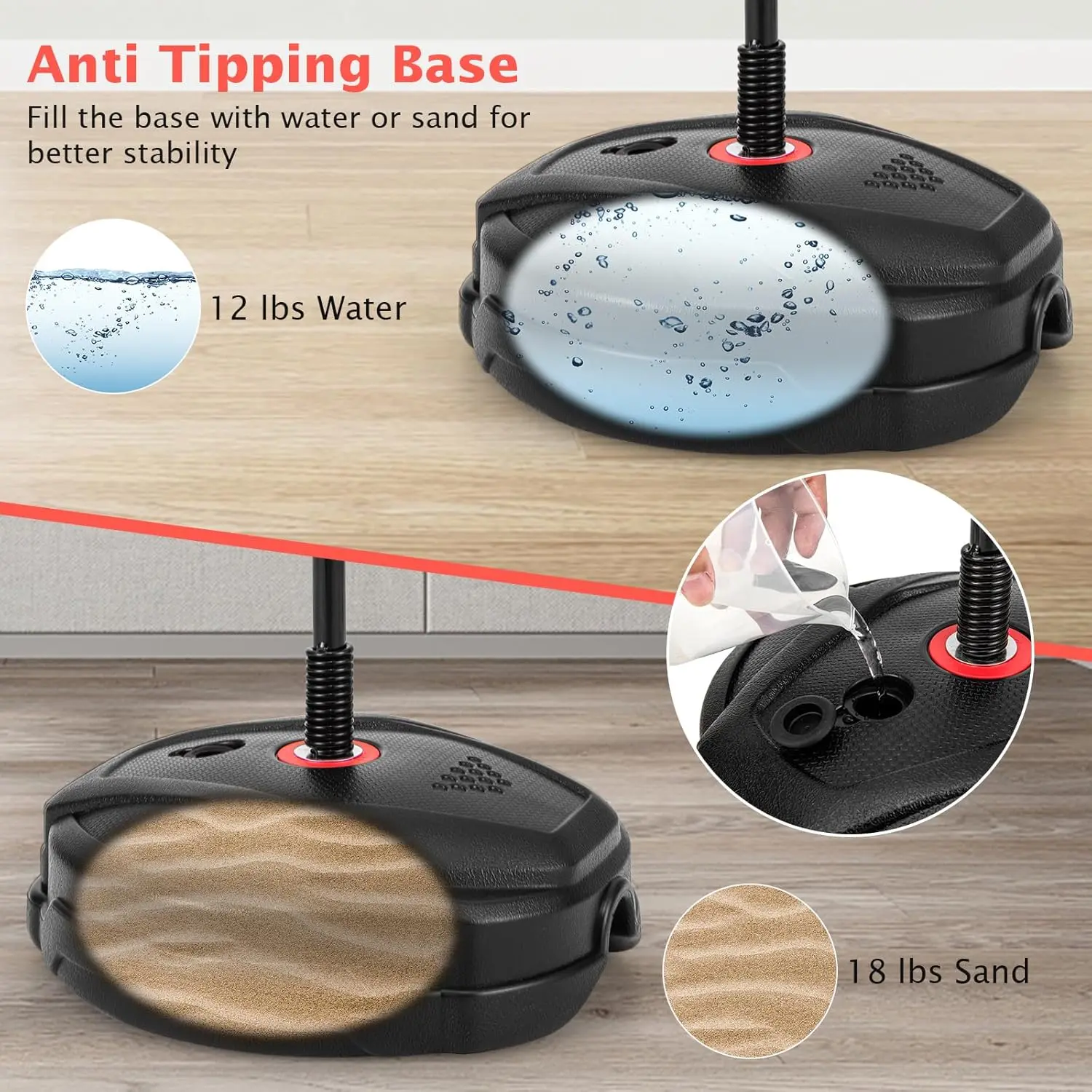 ·Stable Structure: The sturdy PE base can be filled with water or sand up to 26.5lbs, ensuring it remains securely in place during vigorous training sessions. Meanwhile, the base has a built-in handle for easy carrying.