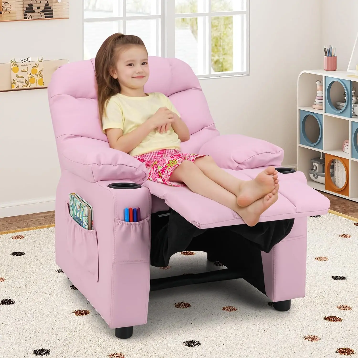 ·Convenient Cup Holders and Side Pockets: The armrests on both sides are designed with a cup holder, which can put the kidsâ water cups within their reach, so that they can be hydrated in time when they are thirsty. In addition, 1 large side pocket and two small front pockets are convenient for storing children's favorite books and snacks.