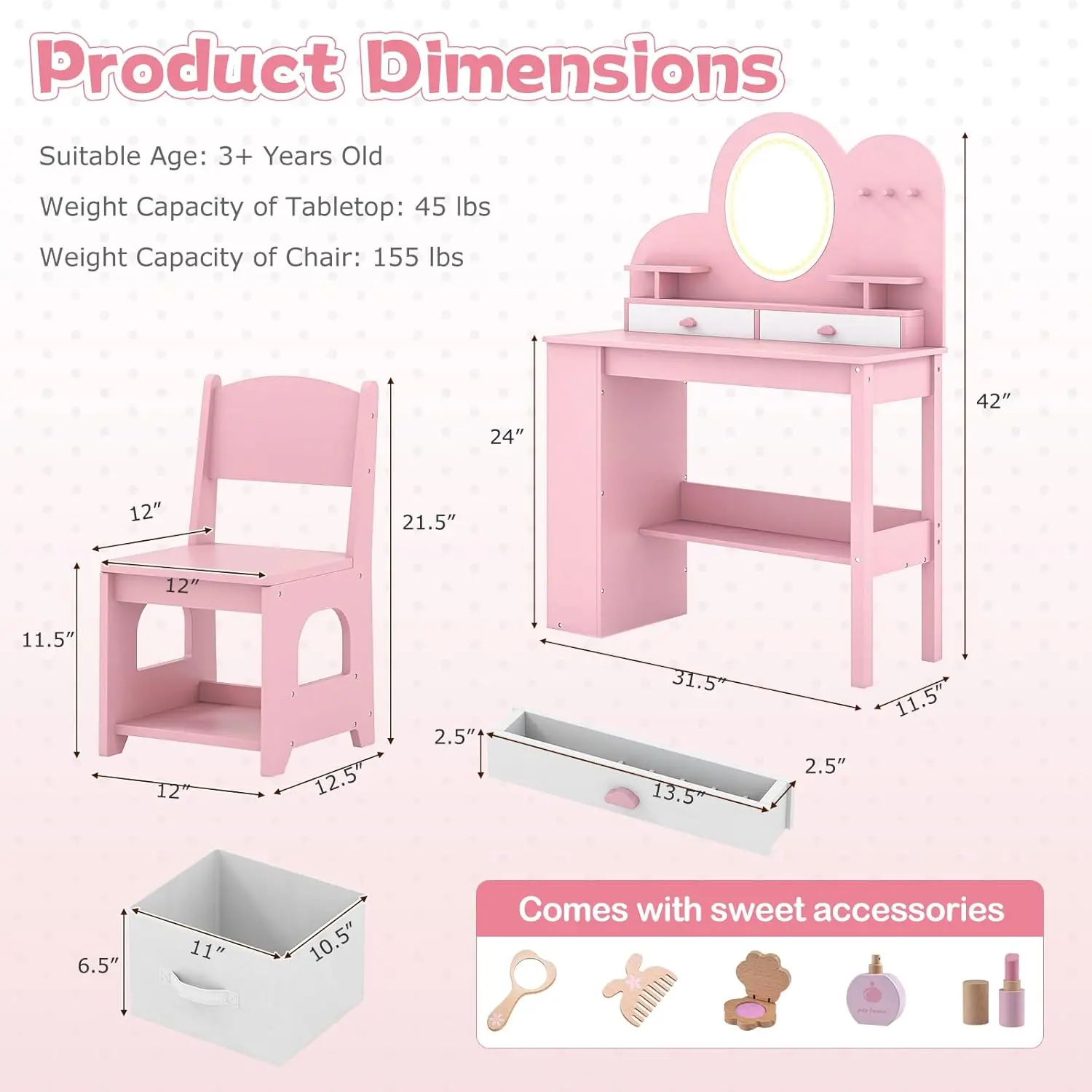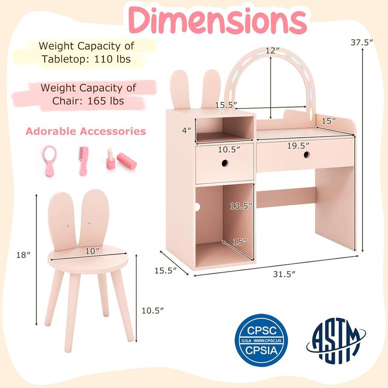 ·Safe & Reliable Kids Vanity Set: The shatter-proof acyclic mirror creates a safe makeup area for your little one. The smooth rounded corners protect kid’s delicate skin from scratches. More importantly, The kids vanity table and chair set complies with ASTM/ CPSIA for higher security.