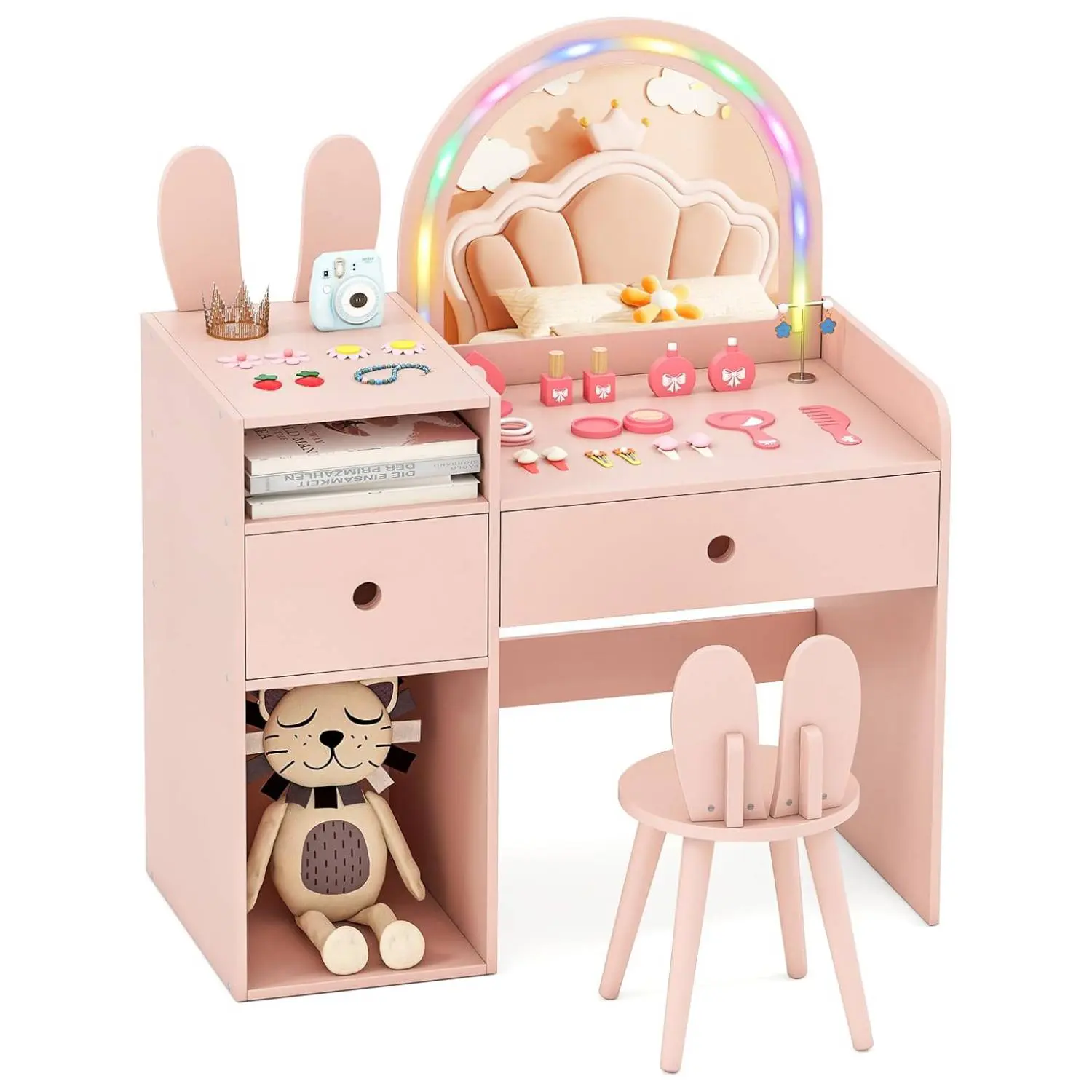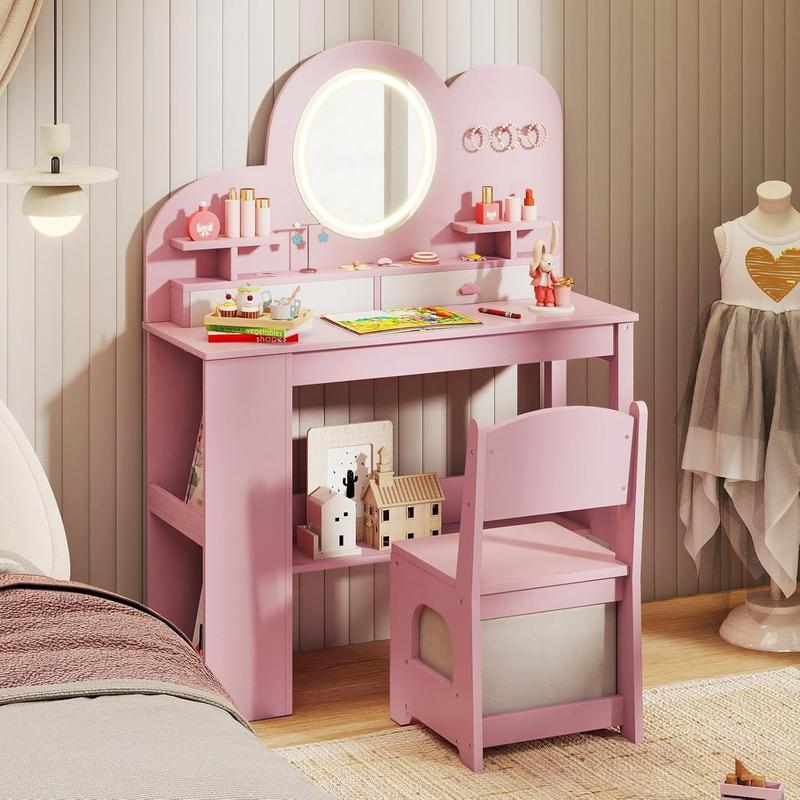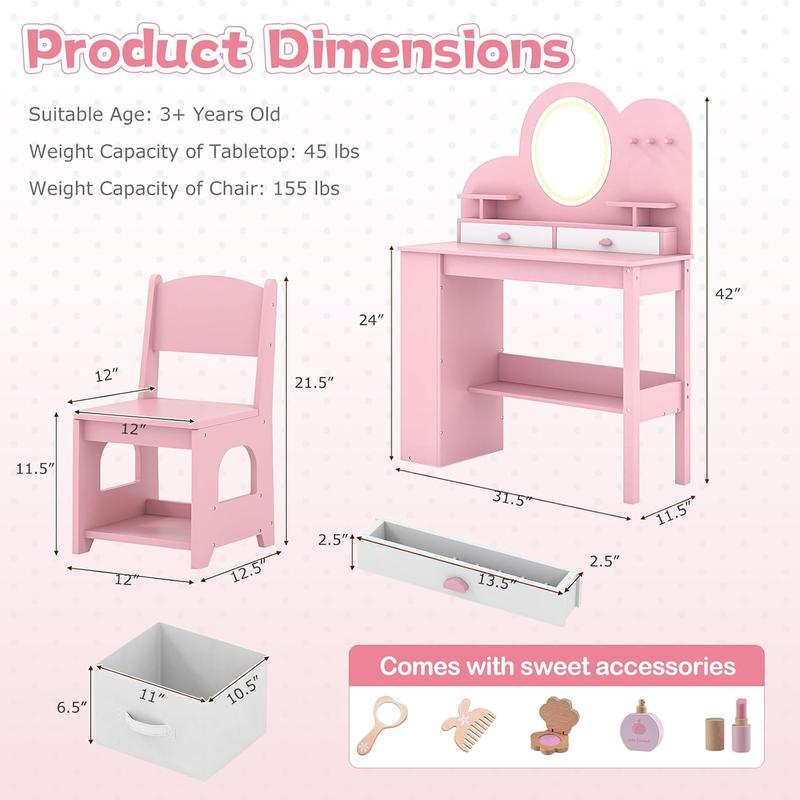 ·Kids Vanity with Lighted Mirror: The kids vanity table features a mirror with colorful LED light strip to offer a magical experience for your little princess as she gets ready for the day. (Please note that batteries are required but not included.)