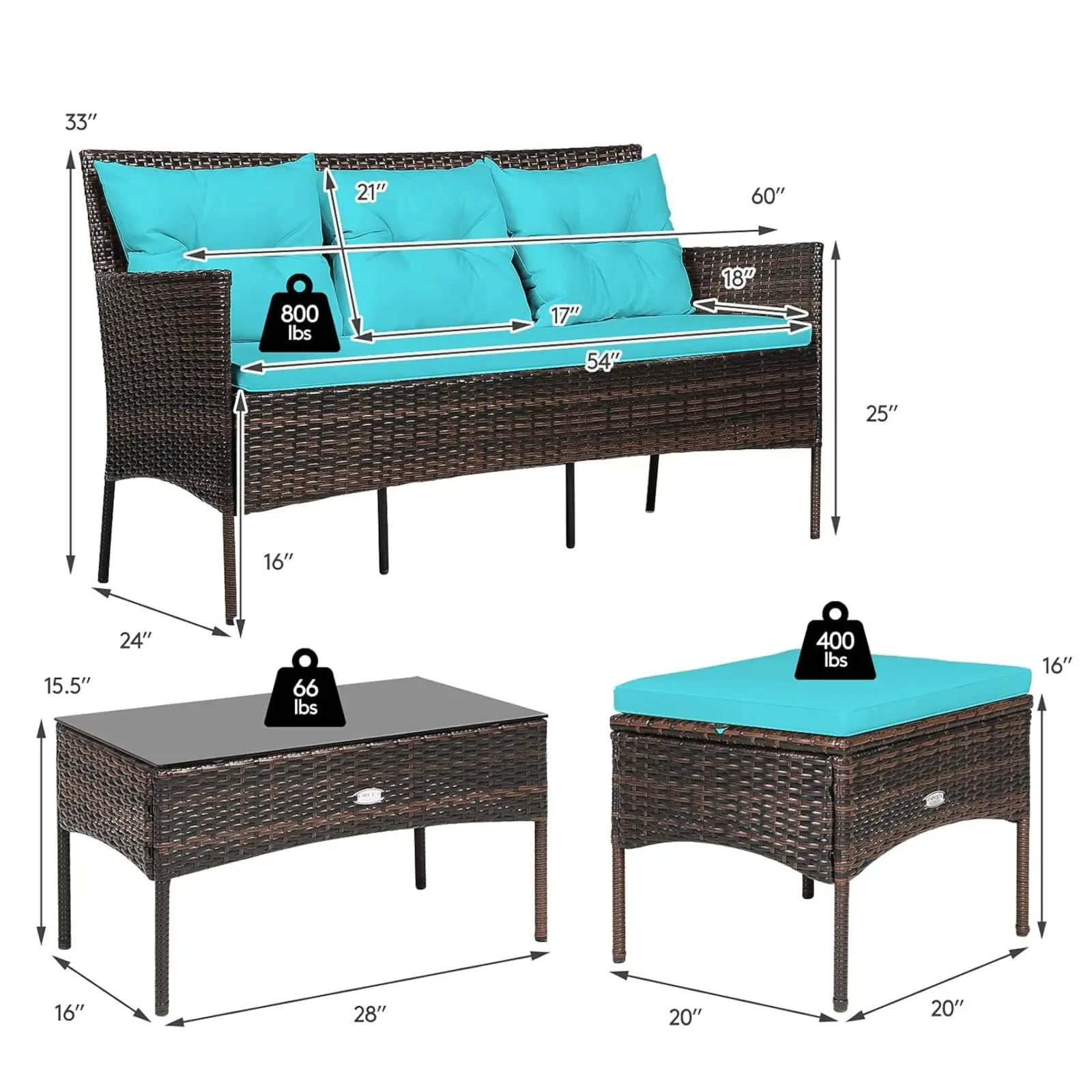 ·Easy Assembly & Flexible Combination: With clear instruction and complete hardware kits, the installation is quite easy. And the sofa (60”x 24” x 33” (L x W x H)), ottoman (20” x 20” x16” (L x W x H)) and coffee table (28” x 16” x 15.5” (L x W x H)) can be separately used or combined in different ways according to your needs.