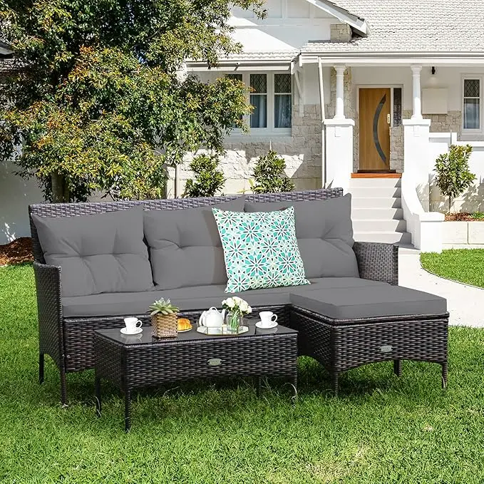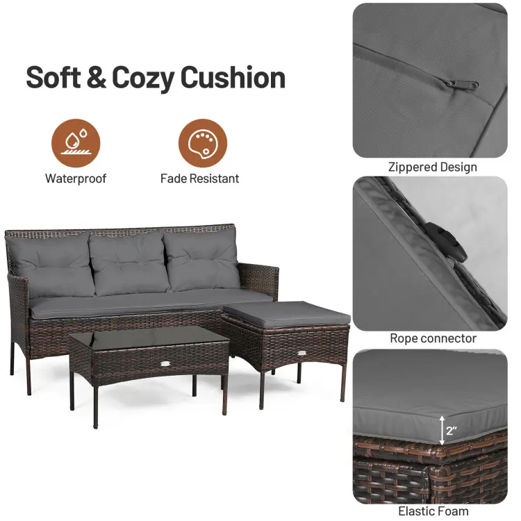 ·Cozy Seat & Elastic Cushions: The wide sofa with high backrest and curved armrest offers extra comfort. And our patio set is equipped with 2 seat cushions and 3 back cushions which possess high density. Additionally, the rope connector can fix cushion to the ottoman and zippered design ensures easy maintenance.