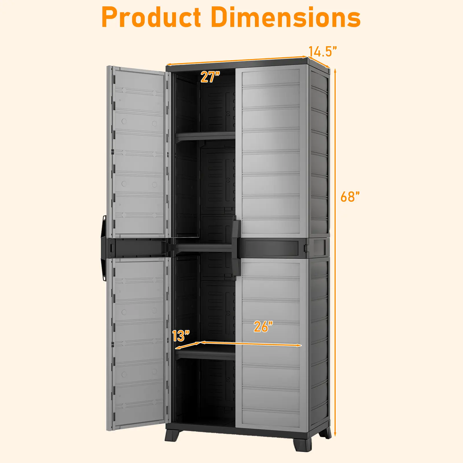 Standing tall at 68 inches in height, this freestanding cupboard maximizes vertical storage capacity, making it perfect for organizing items in your garage, laundry room, pantry, basement or office with ease and efficiency.