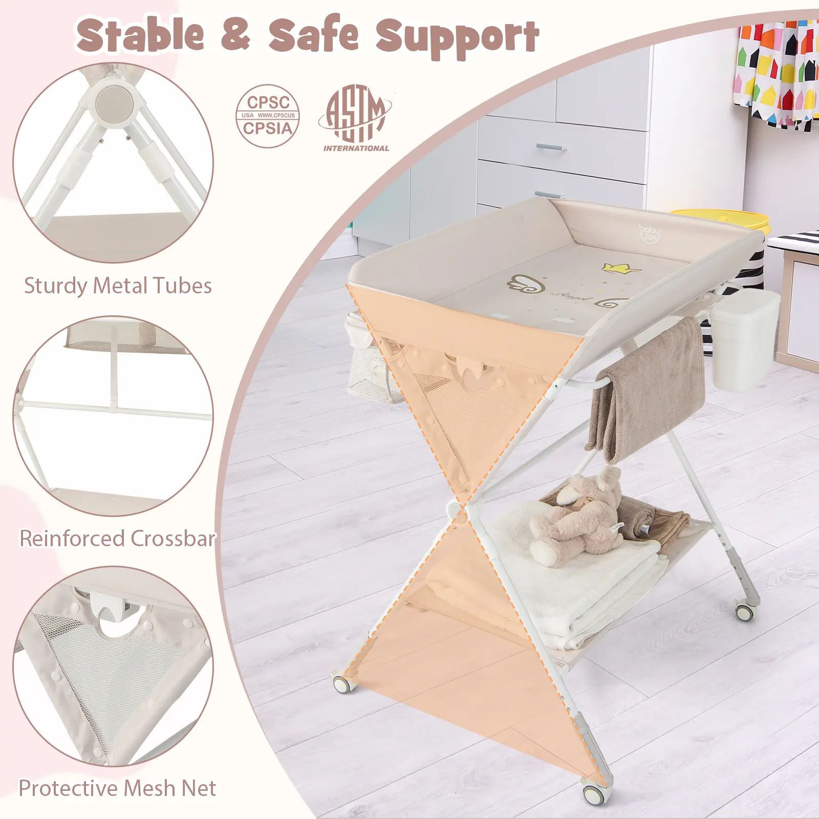 ● Foldable and Adjustable Design: Featuring a 3-level adjustable height (33"/34"/35"), this baby changing station is ideal for parents of different heights (5.2-5.5ft), alleviating back stress from bending over. When not in use, you can press the button on both sides to fold the changing table and use the hook to secure it. ● Considerate Design: The sturdy metal tubes offer strong support, and the middle reinforced crossbar ensures additional sturdiness. Heightened 4 sides create a protective space for your baby, while the height gauge on the changing pad makes it easy to keep track of the baby's growth. In addition, there is a small trash can for added convenience. ● Ample Storage Space: The changing table is equipped with a zippered 3-compartment storage basket, side towel rack and bottom storage shelf, which can keep all your baby's essentials such as diapers, wipes, clothes, etc. within arm's reach. ● Versatile Use and Easy Care: This foldable infant nursery organizer is ideal for not only changing diapers or clothes, but also massage and nursing, giving your baby a bath, hanging clothes and more. The waterproof oxford cloth is removable and washable. Plus, it complies with ASTM and CPSIA for reliable security. ● Effortless Mobility: The diaper changing station is designed with 4 universal wheels for easy movement. The lockable design ensures stability when in use, making it a safe and convenient option for your home nursery setup. Moreover, the wheels can be detached with ease. Suitable age: 0-12 months old; weight capacity: 24 lbs.