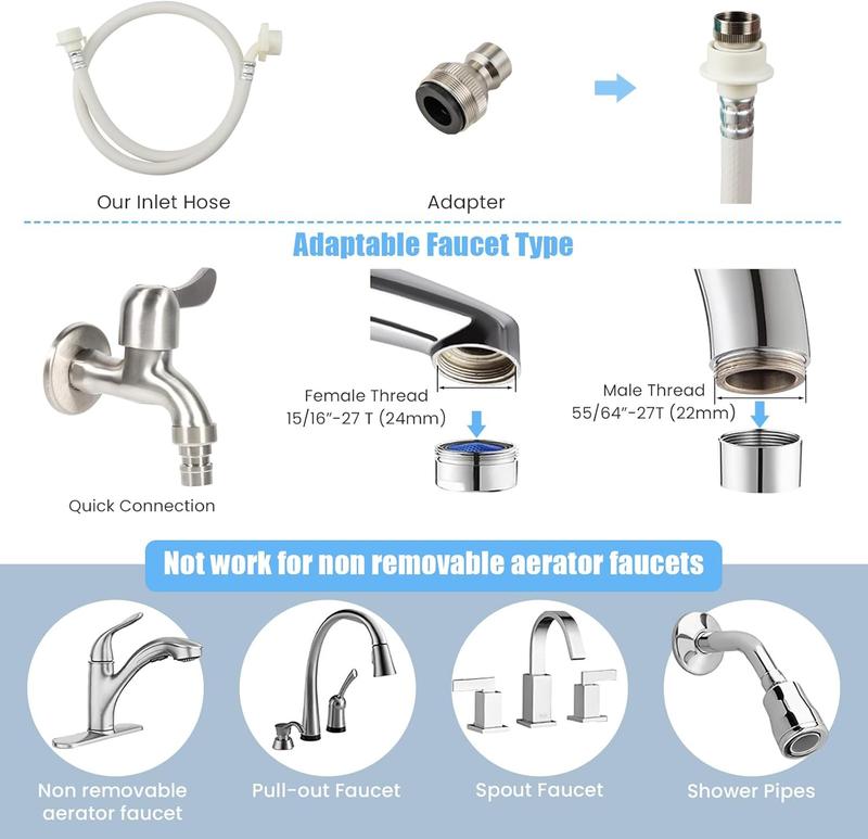 First off this washing machine is amazing and it cleaned my clothes better than any laundromat I've ever been to the adapter for the sink did not fit my bathroom sink or my kitchen sink so I had to fill it manually with the bucket I'm still not mad about that