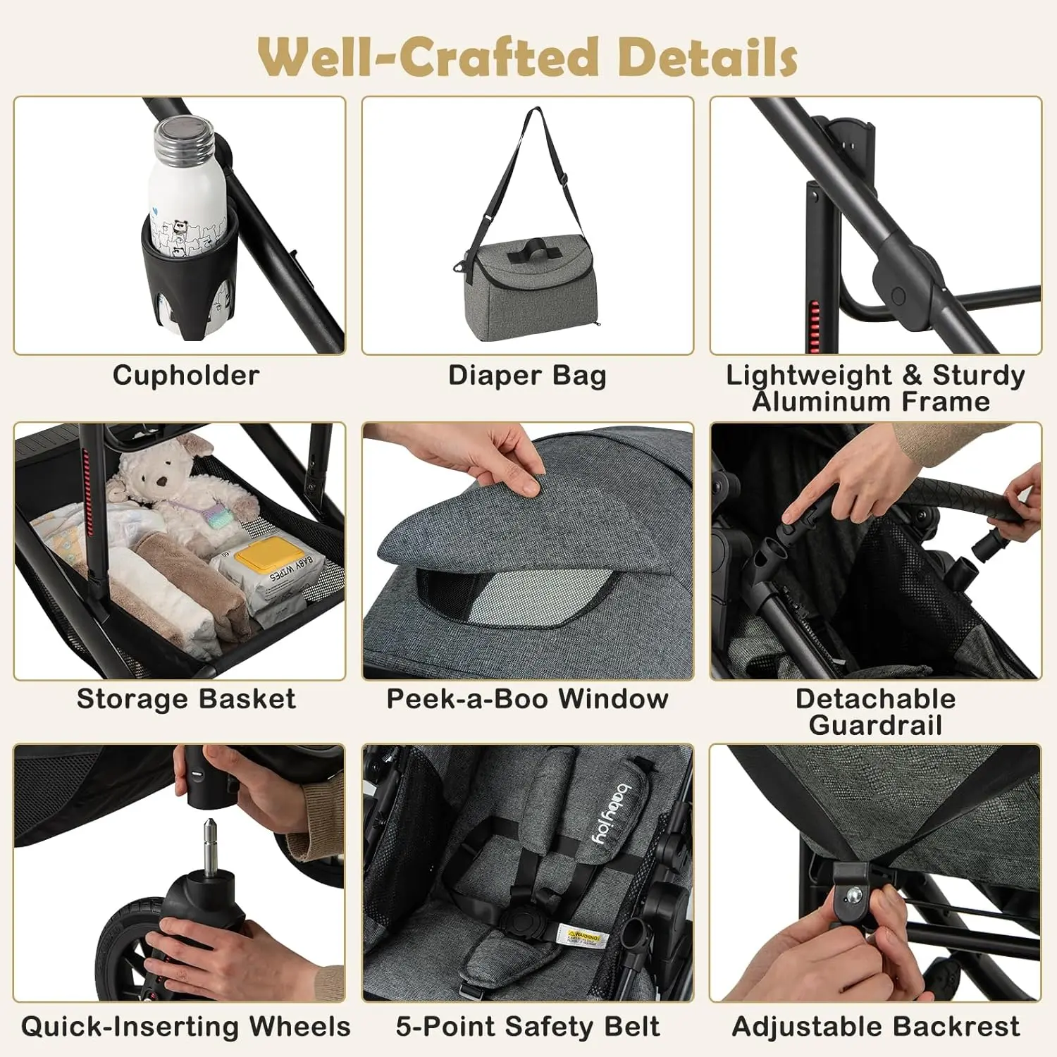 ·Well-Crafted Stroller: The pushchair comes with a detachable and washable footmuff, diaper bag, cup holder, storage basket, peek-a-boo window and quick-inserting wheels for more comfort and convenience. And the detachable guardrail and 5-point safety belt ensure higher safety. Moreover, the high landscape design will keep your little one away from car exhaust and other harmful elements.