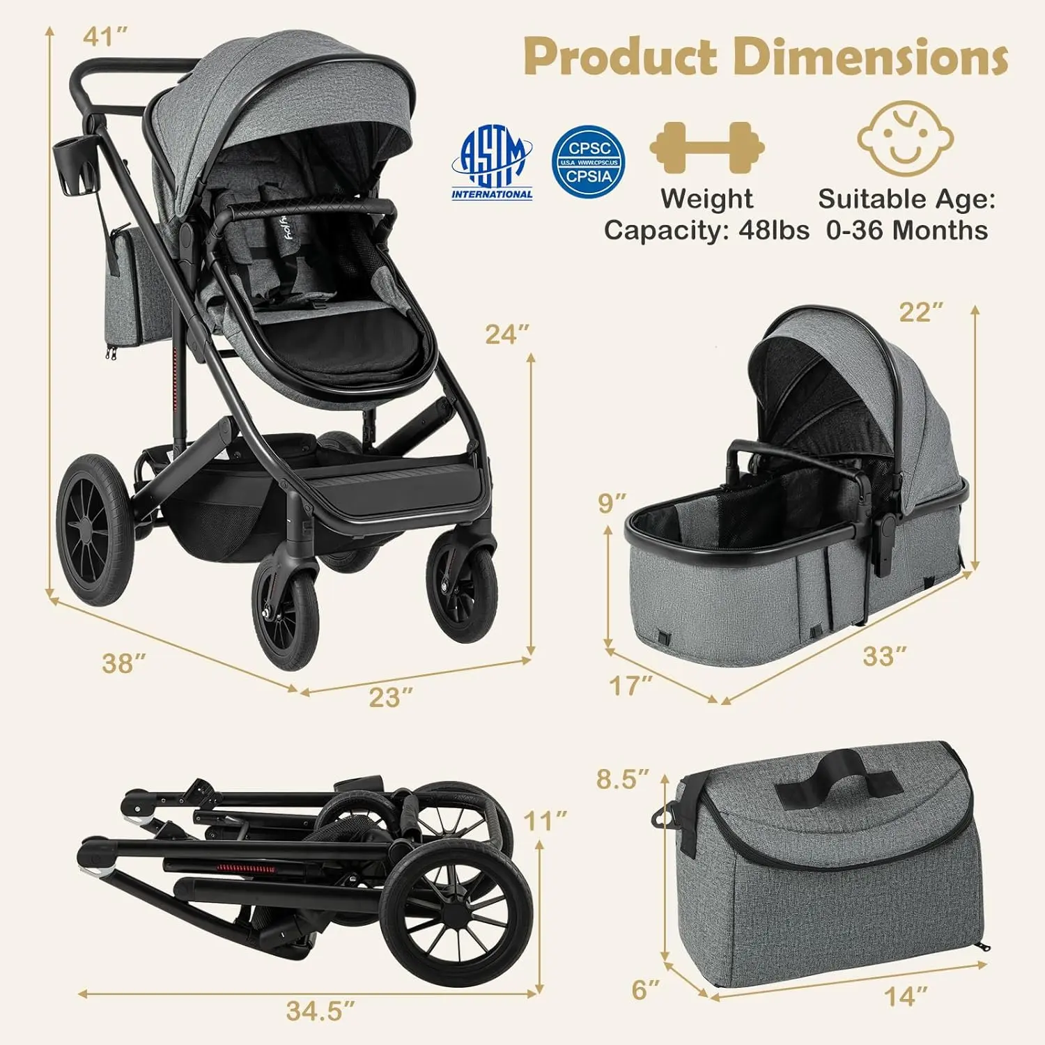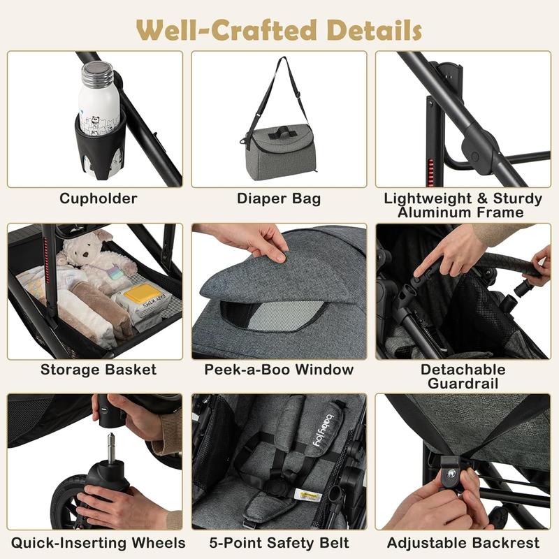 ·Easy to Detach & Fold: Featuring a detachable bassinet for independent use and a foldable lightweight and sturdy aluminum frame, this stroller combines convenience with portability, simplifying storage and transport. Note: Please detach the bassinet before folding.