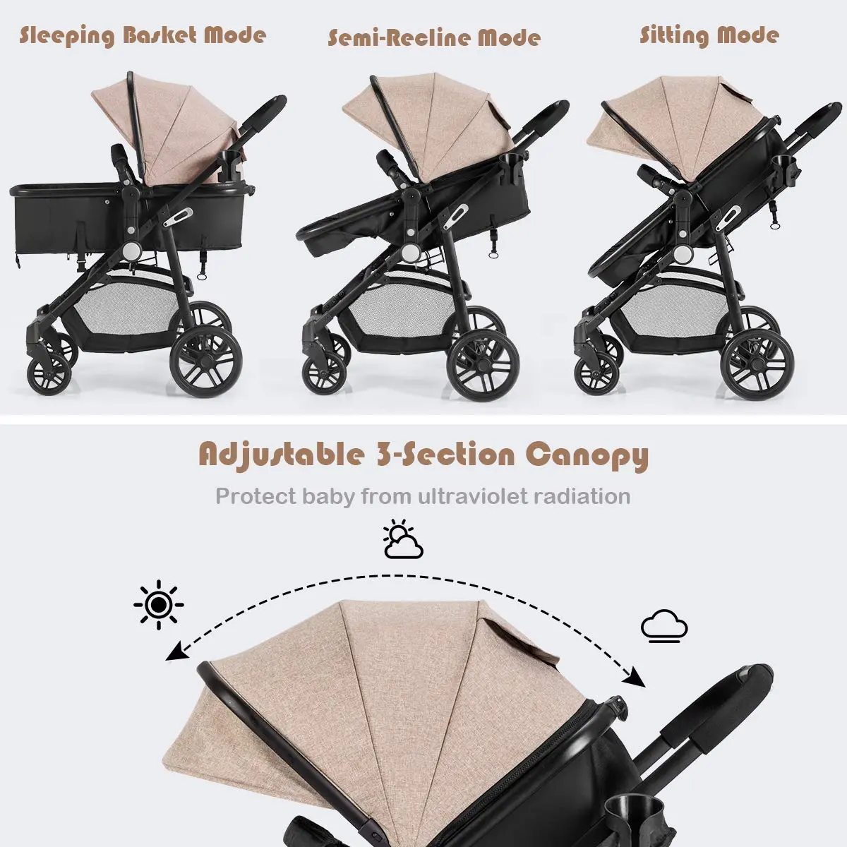 ·Multiple Adjustable Features: Tailor your baby’s seating experience for ultimate comfort with the 3-position bassinet angle, adjustable backrest and 4-level canopy. Moreover, the 9-position handle is much cozier for parents to grip and push.