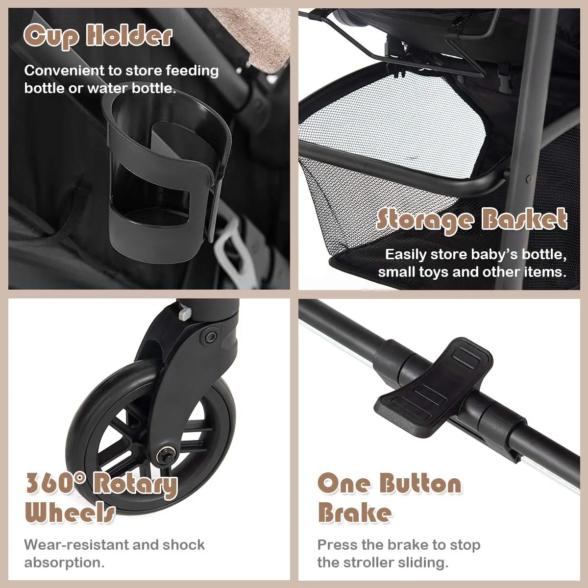 ·Smooth & Safe Movement: The lockable front universal wheels of the baby stroller are designed with shock-absorbing spring and can be locked in direction. Moreover, the one-step rear wheel brake ensures secure location. All the 4 wheels are of high quality, which are available for asphalt rod, brick road, boardwalk and cement road.