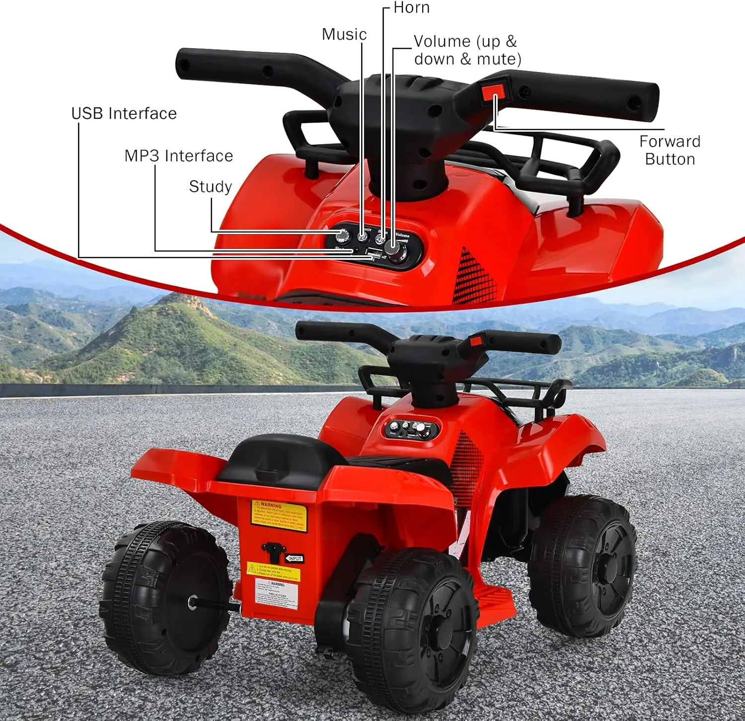 ·Multifunctional Media Platform: Amplify the entertainment with ATV's fully integrated media console, featuring a study button, music button, horn, and volume adjustment. Connect and play your child's favorite tunes or stories through the MP3 slot and USB port, creating an engaging ride that stimulates their senses and imagination.