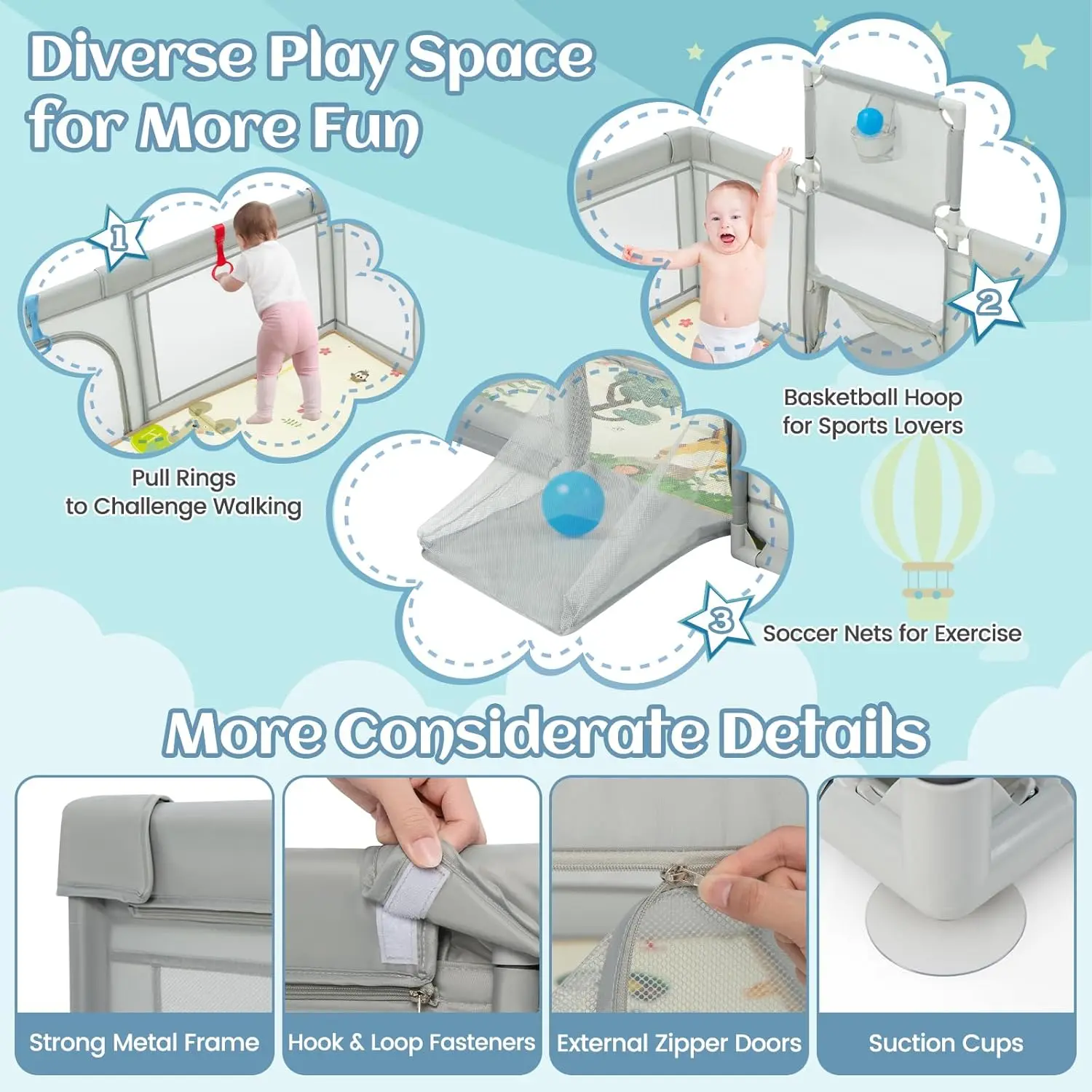 Β·Sturdy & Secure Structure: The infant playpen features firm metal pipes and upgraded reinforced connections that ensure the fence is not easily bent. The anti-skid suction cups on the bottom to ensure optimal stability