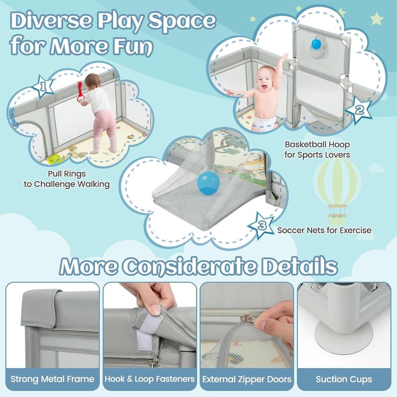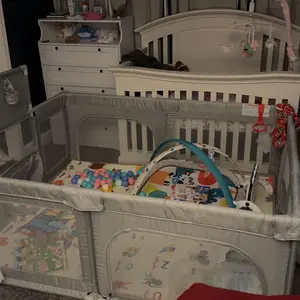 ·Safety Play Area: The metal pipe at the top of the fence is wrapped in soft and thickened cotton padding, and the four corners are covered with anti-collision corner protection to keep children safe. In addition, the fence is tightly connected and has no gaps to ensure safe play for kids