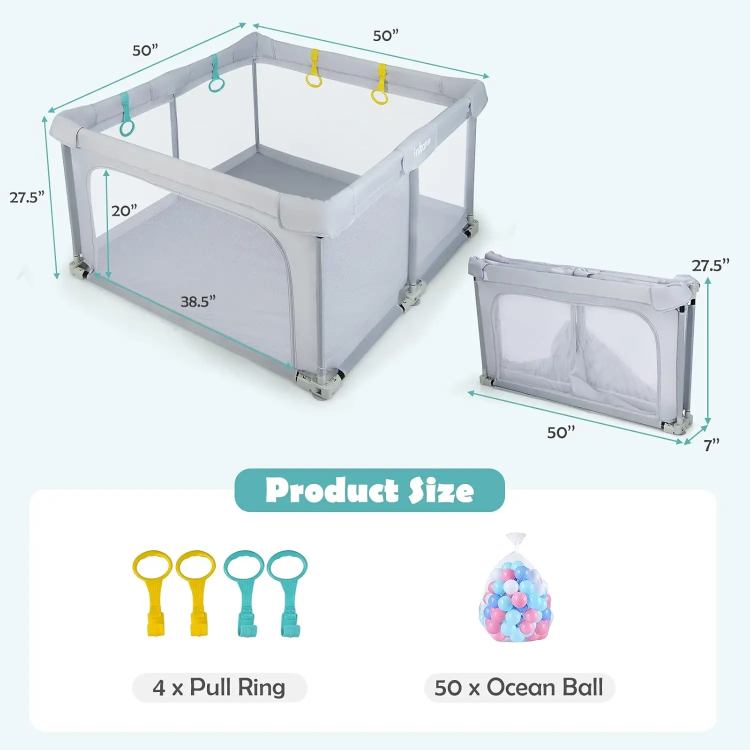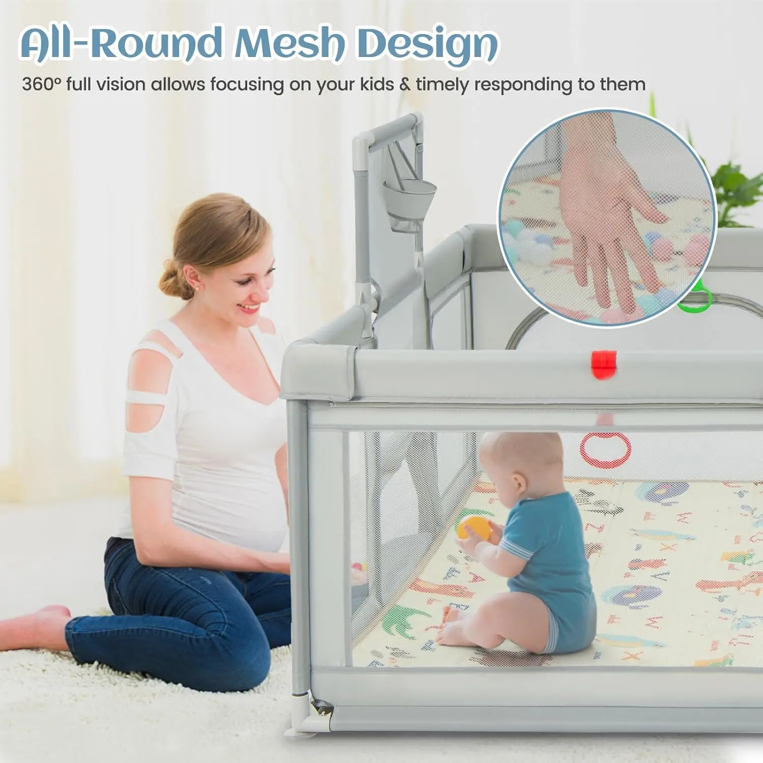 Β·Spacious Baby Playpen: Our Infant baby playpen provides large area for babies to play and hold many toys. It promotes physical and cognitive growth. The fence is 27 inches high, and it's high enough to keep the baby from climbing out