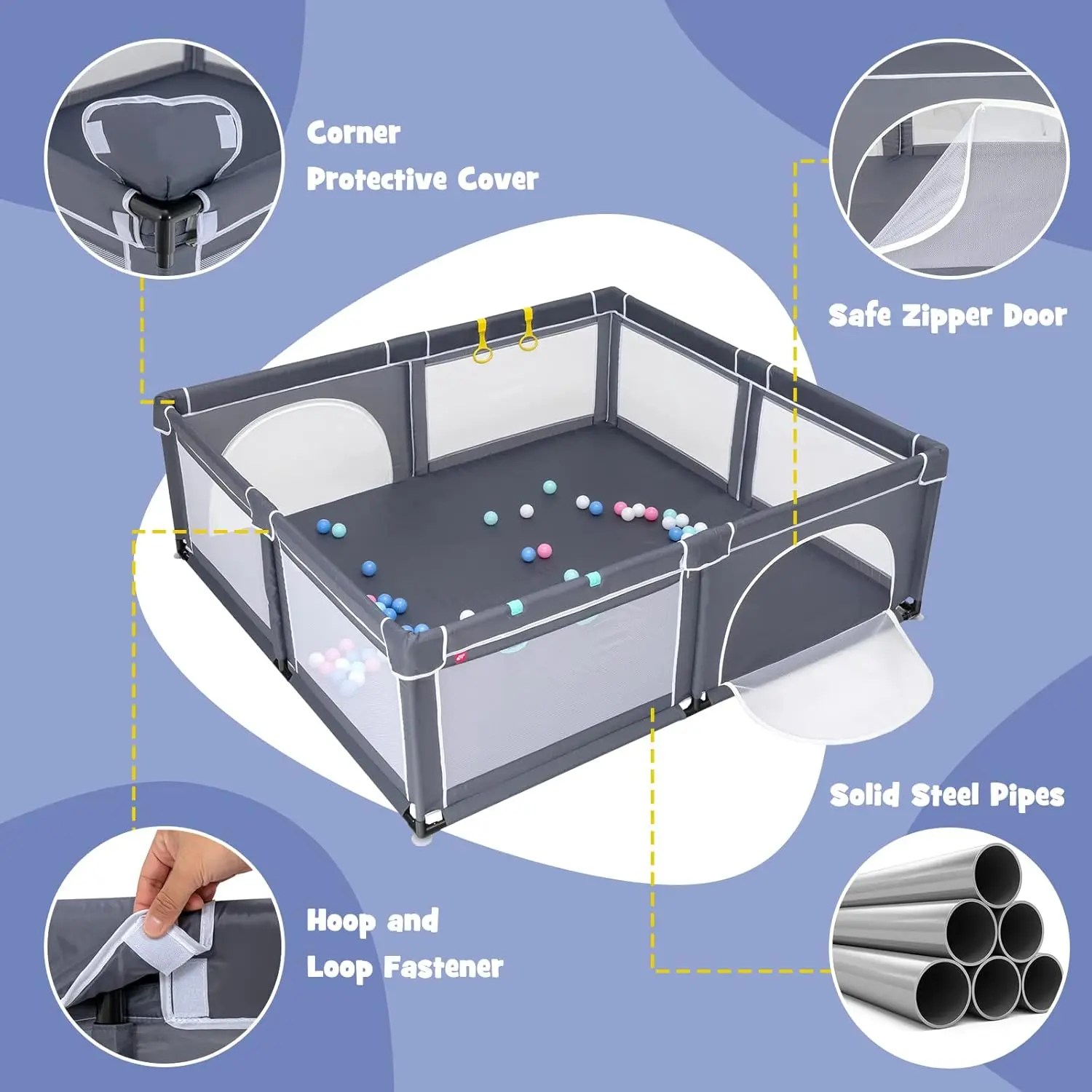 Β·Safety Play Area: The metal pipe at the top of the fence is wrapped in soft and thickened cotton padding, and the four corners are covered with anti-collision corner protection to keep children safe. In addition, the fence is tightly connected and has no gaps to ensure safe play for kids
