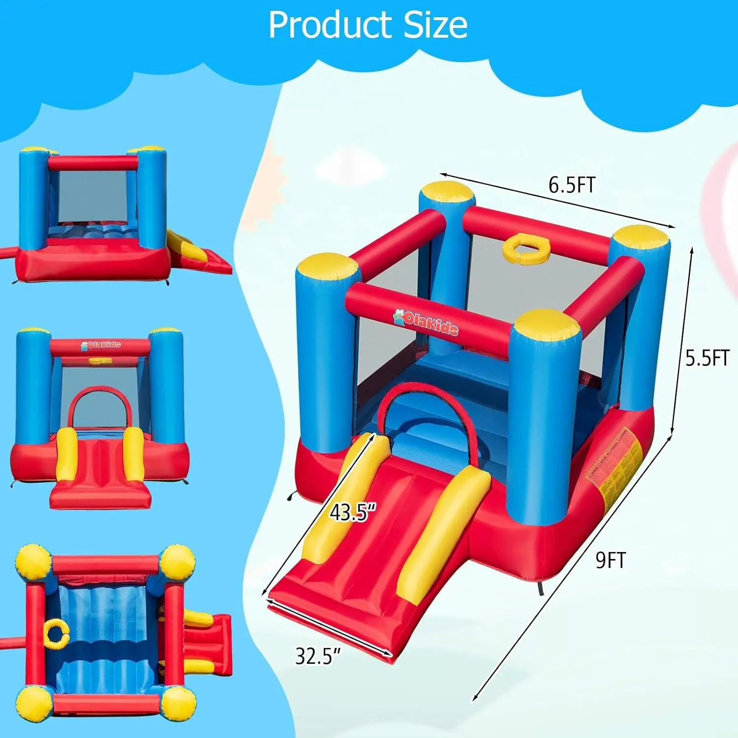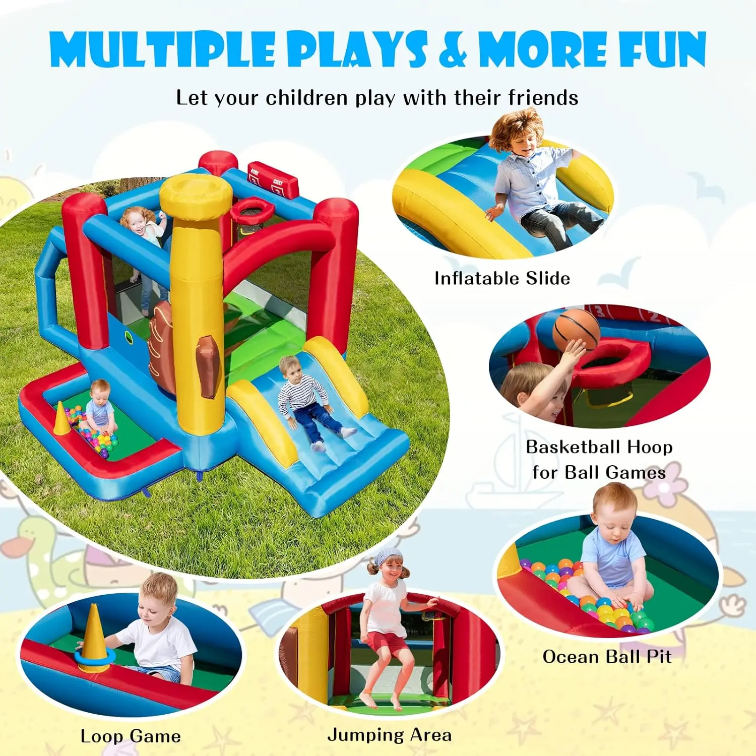 ·Rich Play Choices: The inflatable house offers numerous play areas for children. Featuring two slides, a basketball hoop, and a climbing wall, it encourages coordination and muscle exercise of children. Additionally, 50 ocean balls are included to enhance the fun factor.