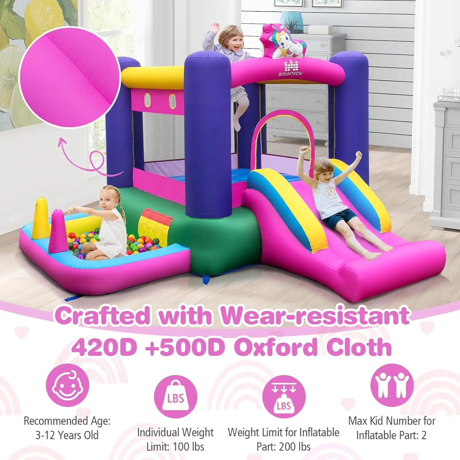 ·Premium Materials & Safety Design: The inflatable bouncer comes with PVC-coated Oxford appearance. Meanwhile, seamless stitches and double reinforced sewing add its durability. The handrail on the elevated slide extends to 13.5’’ and protective mesh net, offering additional safety for users as they play.