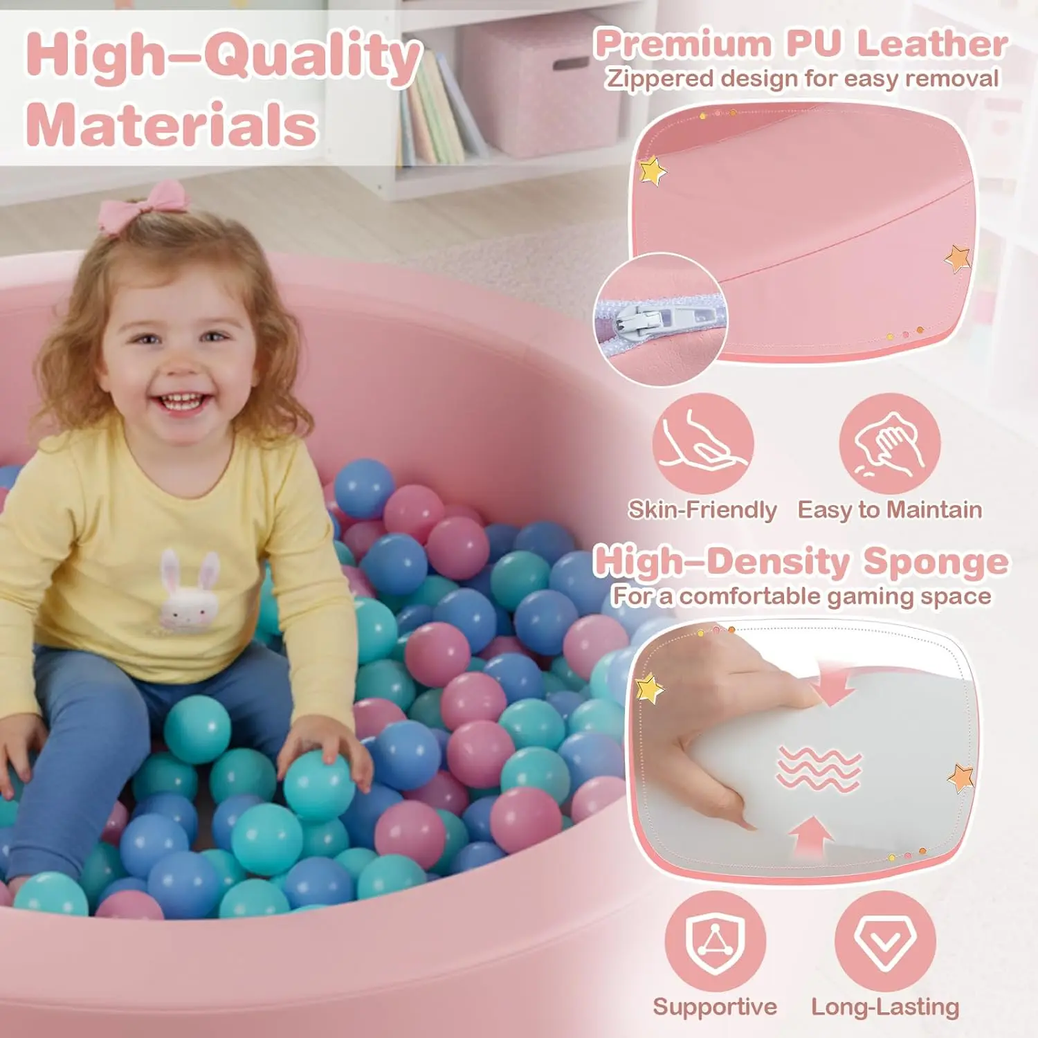 ·Removable PU Leather Cover: Keeping the ball pit tidy is simple with its high-quality PU leather cover. This enduring surface resists messes and wipes clean with ease, perfect for busy parents. The convenient zippered and removable design allows you to take the cover off for effortless cleaning.