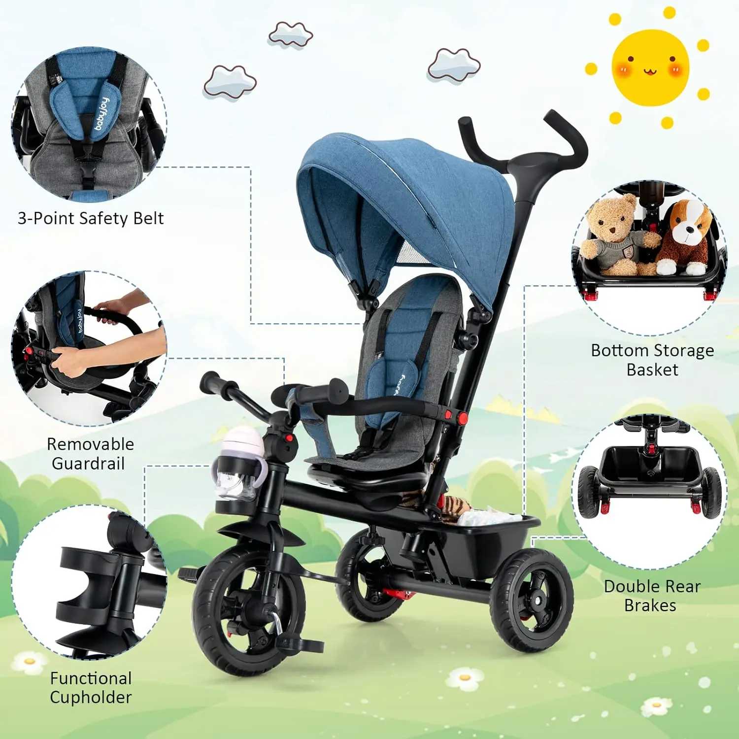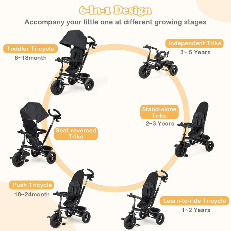 ·[ Grow with Your Little One ]: With detachable canopy, seat cushion, footrest, guardrail and push handle, this baby tricycle features 5-in-1 multifunctional design. It can be used as a baby stroller, seat-reversed tricycle, push trike, learn-to-ride trike or stand-alone trike according to the demands of your kids, accompanying them in different growing stages.
