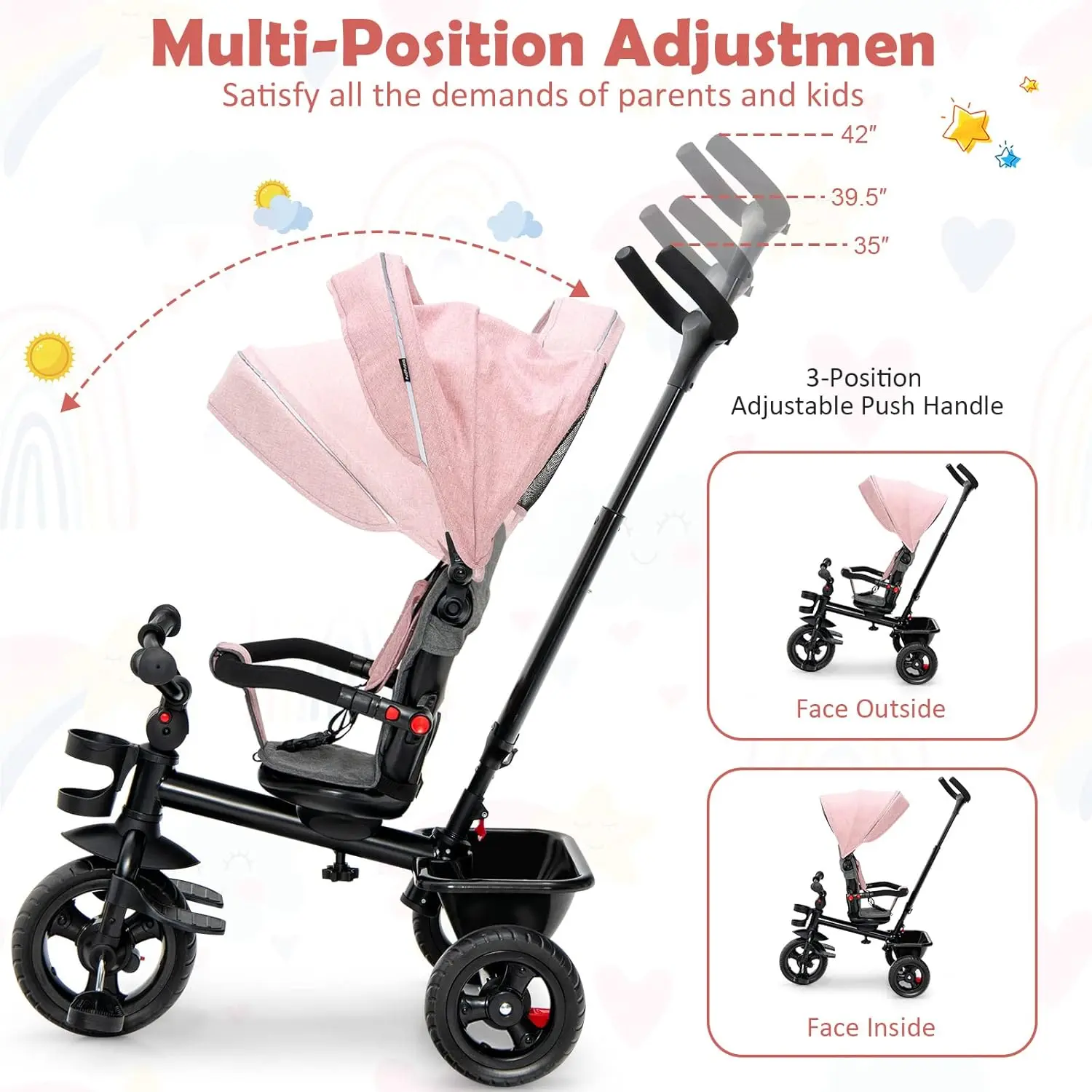 ·[ Reversible & Adjustable Trike ]: The seat of the kids’ tricycle can be reversed by loosening the screws on the bottom. Thus, you little one can either face outside or inside. What’s more, the top canopy can be adjusted into 3 positions according to the climate change. And the push rod can be lift up or down to match parent’s height.