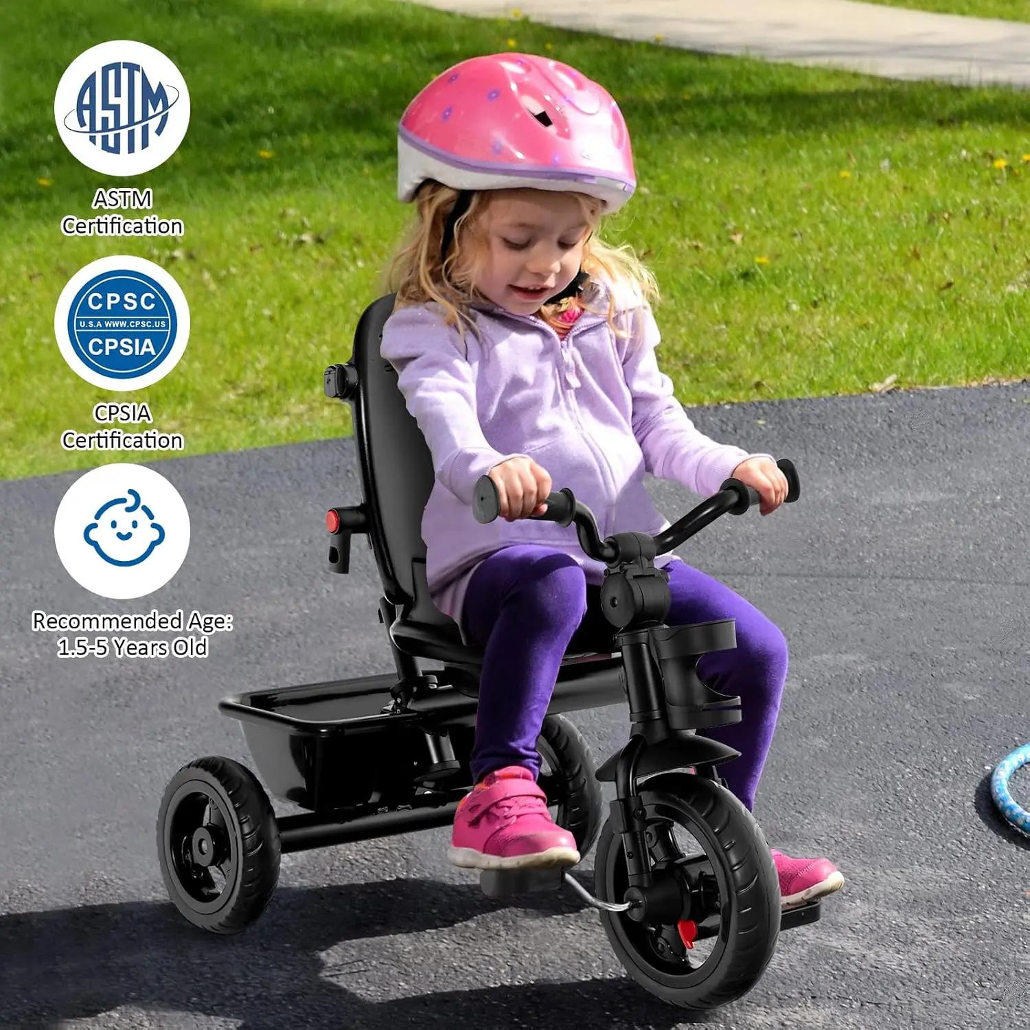 ·[ Designed for Safety ]: For kid’s security, the trike is designed with a 3-point safety belt, which can keep kids in a safe and right place. The double brakes on the rear wheels can lead to an emergency stop, ensuring higher safety. Plus, with 135° steering limit, kids can ride more stably. Also, our tricycle has gained the certification of ASTM and CPSIA.