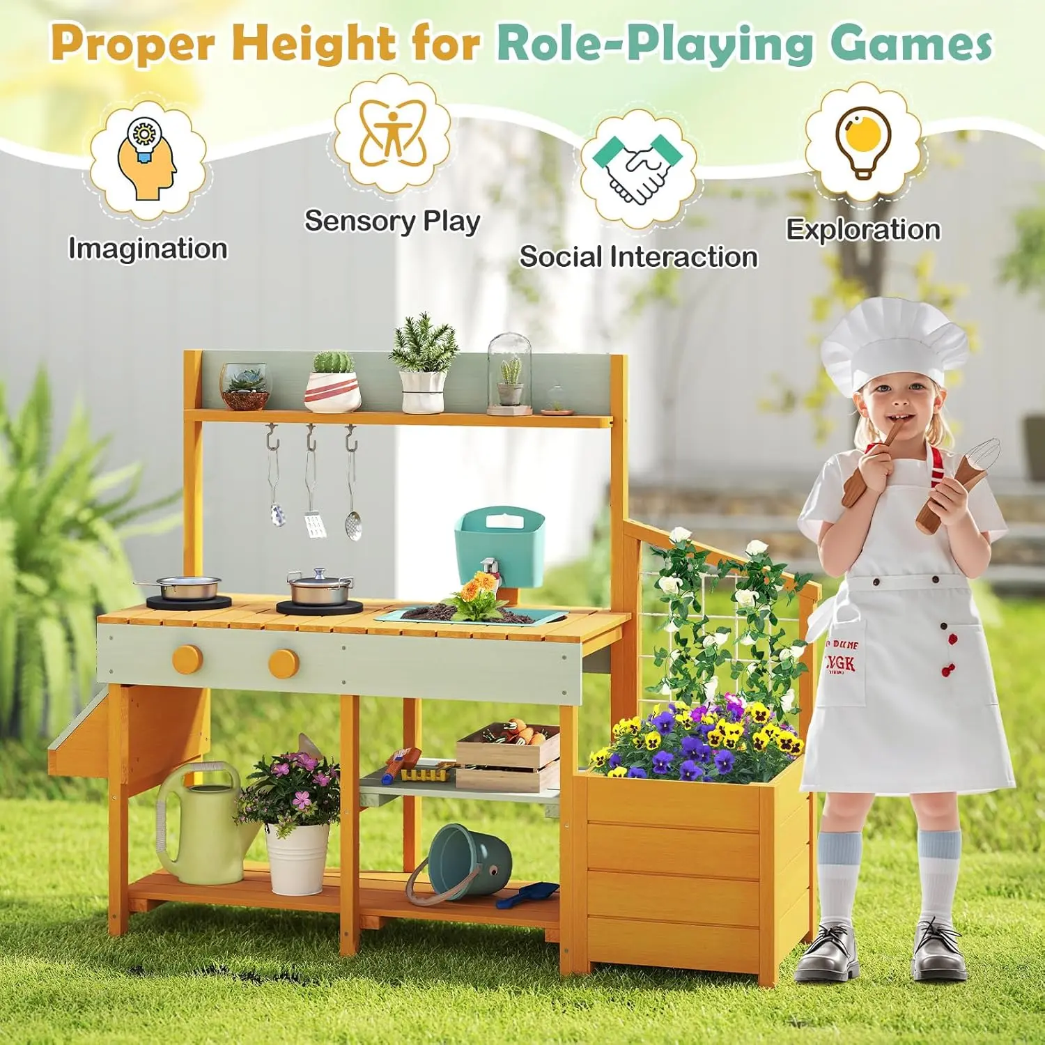 ·Solid Wood Play Kitchen Set: Selected fir wood material guarantees great toughness and excellent durability. Supported by 4 stable legs, our mud kitchen keeps steady and is not easy to wobble. Round corners avoid bumping. What’s more, ASTM and CPSIA certifications enhance overall security.