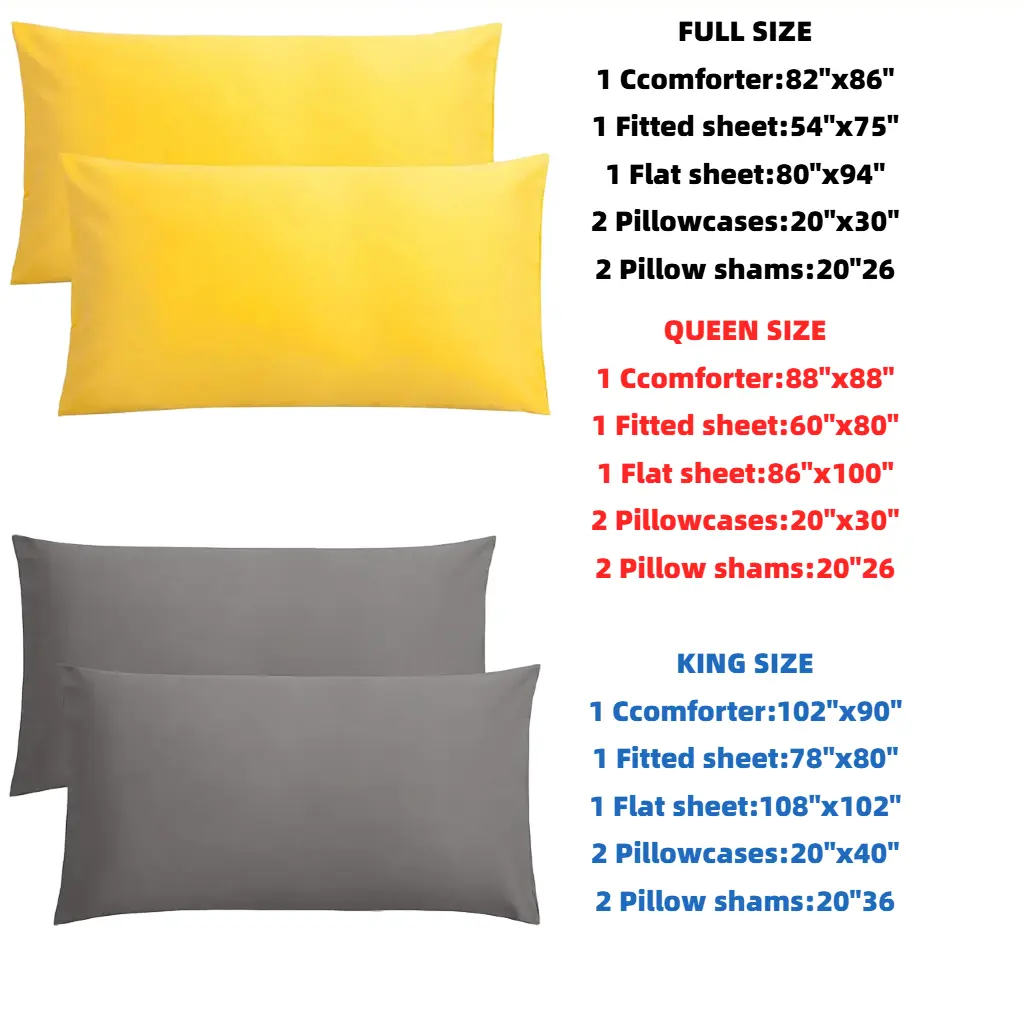 ·Queen Size: Comforter: 88"x88"Flat sheet: 86"x100"Fitted sheet: 60"x80"x15"Pillowcase: 20"x30"Pillow sham: 20"x26"