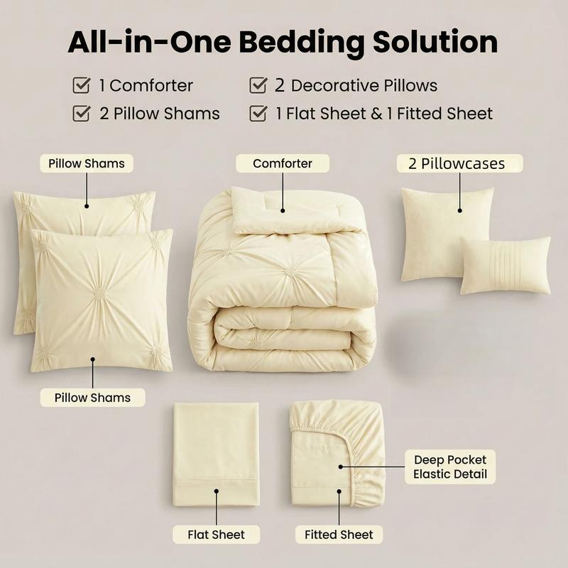Includes 1 comforter + 4 pillowcases + 1 flat sheet + 1 fitted sheet. No extra matching needed—get your full bedroom bedding set in one purchase. More budget-friendly than buying individual pieces, saves time on mix-and-match, and perfect for renters, new home move-ins, guest room setup & more.