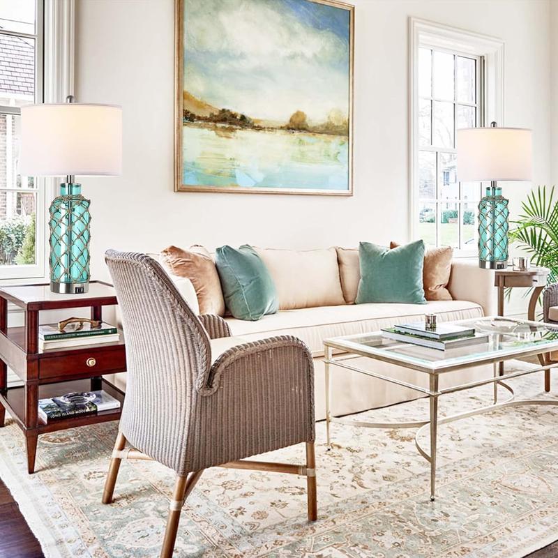·Blue glass accent bottle table lamps: designed with a transparent blue glass bottle vase accented by rope netting, this cottage-style table lamp is paired with a brushed nickel base and topped with a white drum shade, giving you a relaxing coastal mood.