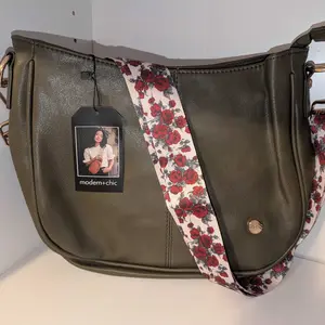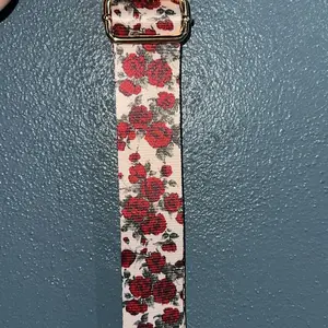 I ordered this strap because I love the roses. It looks so good with black bags but also olive or green bags too! Gives a nice pop of color.