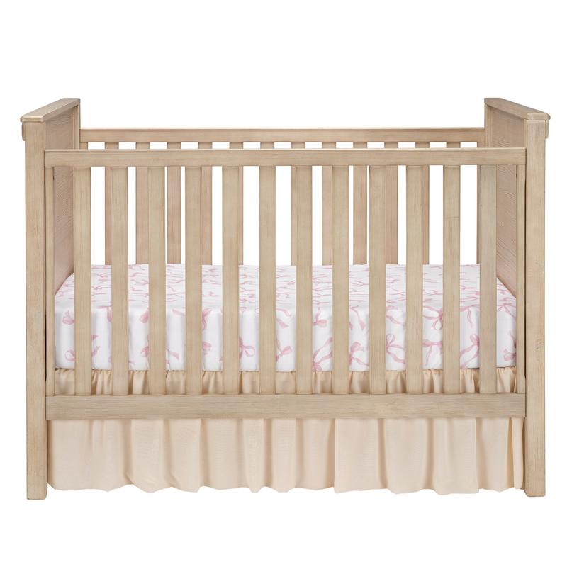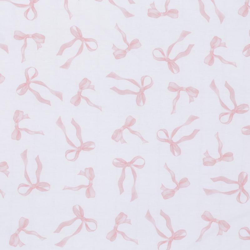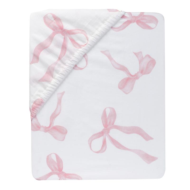 Pretty pastel pink bows add a sweet touch of elegance to your child’s crib. This breathable 100% cotton fitted crib/toddler sheet features beautiful blush color bows in a lovely watercolor style. There is elastic all the way around ensuring a safe and secure fit on a standard sized crib and toddler mattress measuring approximately 52 inches by 28 inches.