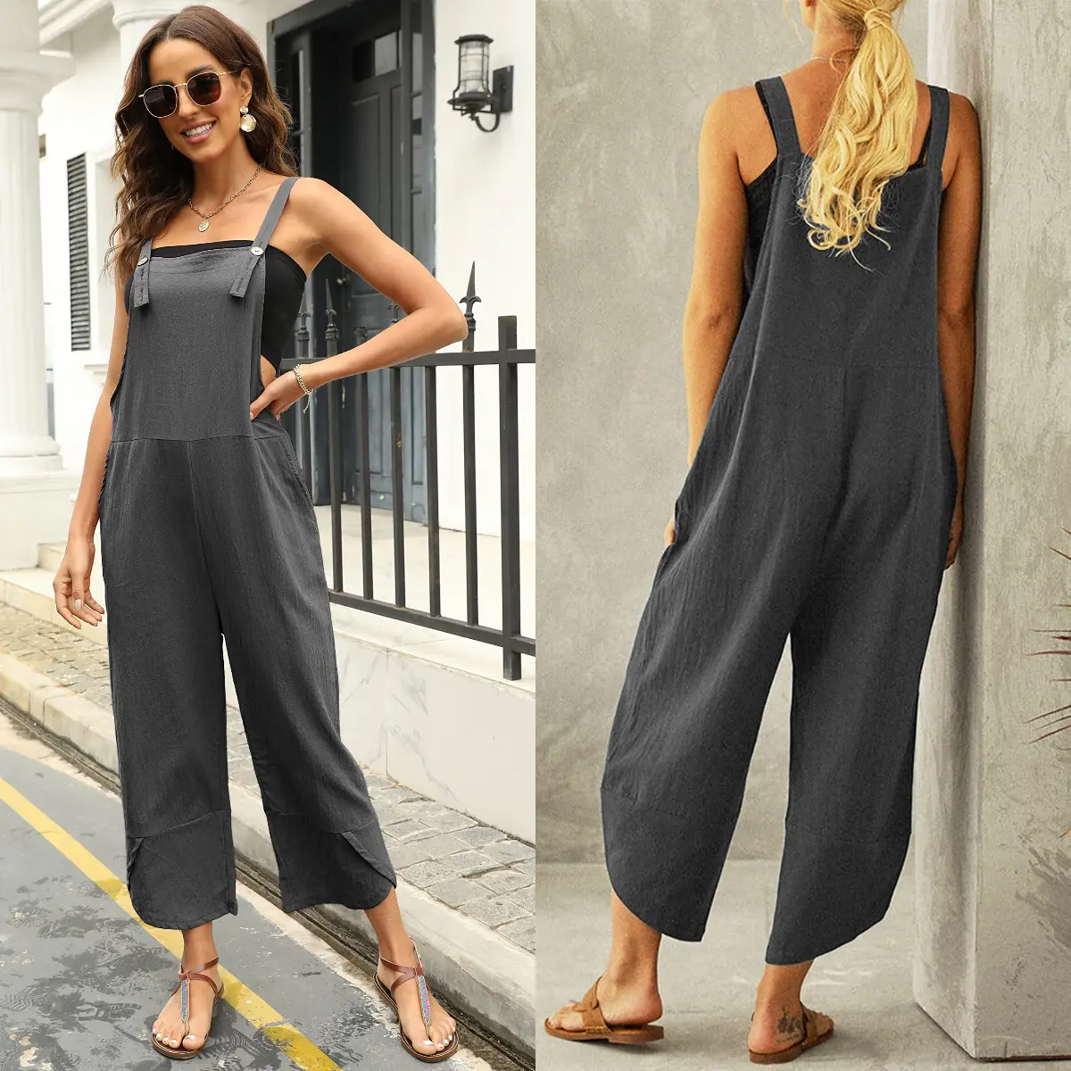 Wide-leg, sleeveless, high front and back, 2 side pockets,soid color, classic relaxed fit linen jumpsuits, looks chic and fashion